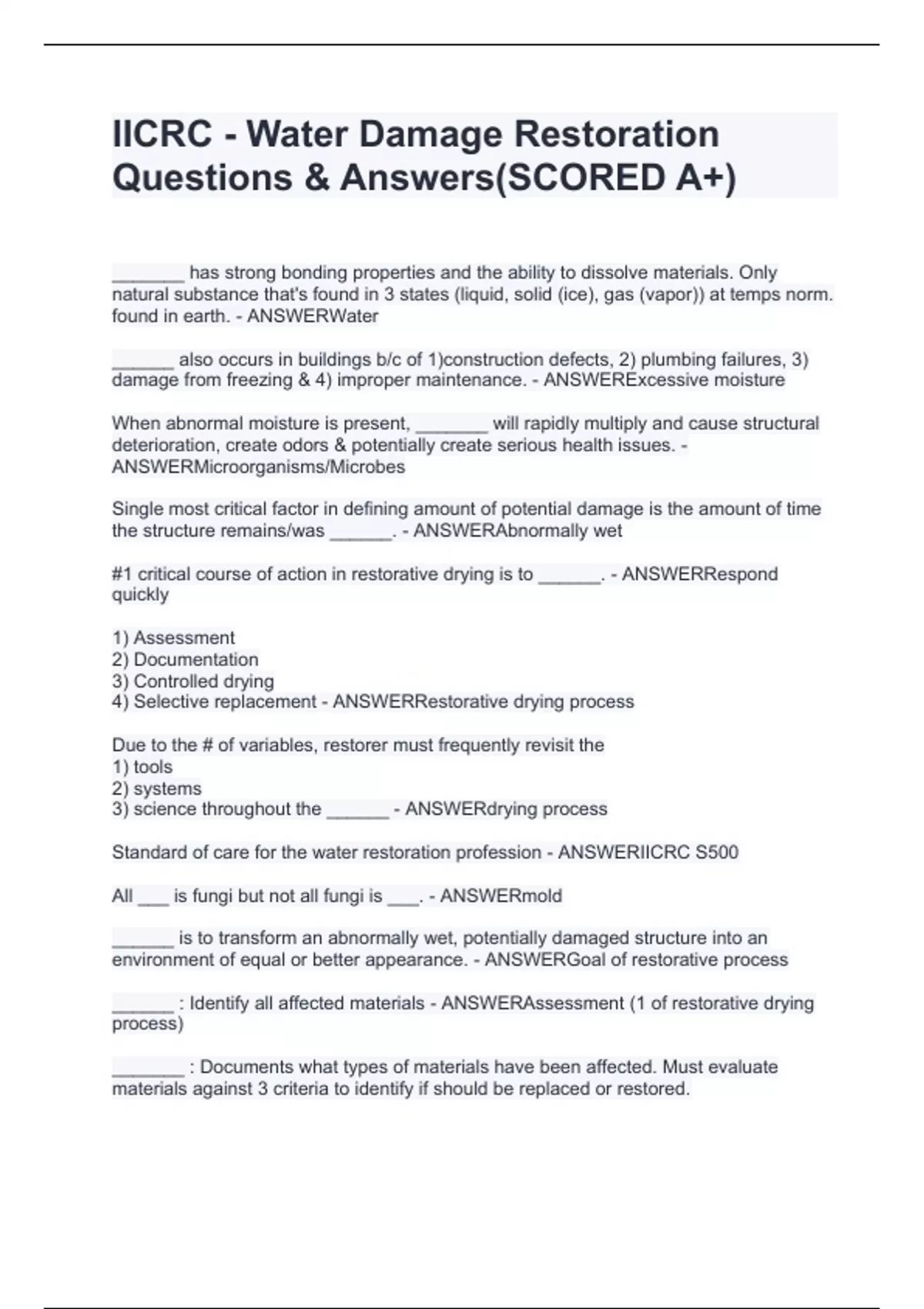 IICRC - Water Damage Restoration Questions & Answers(SCORED A+)
