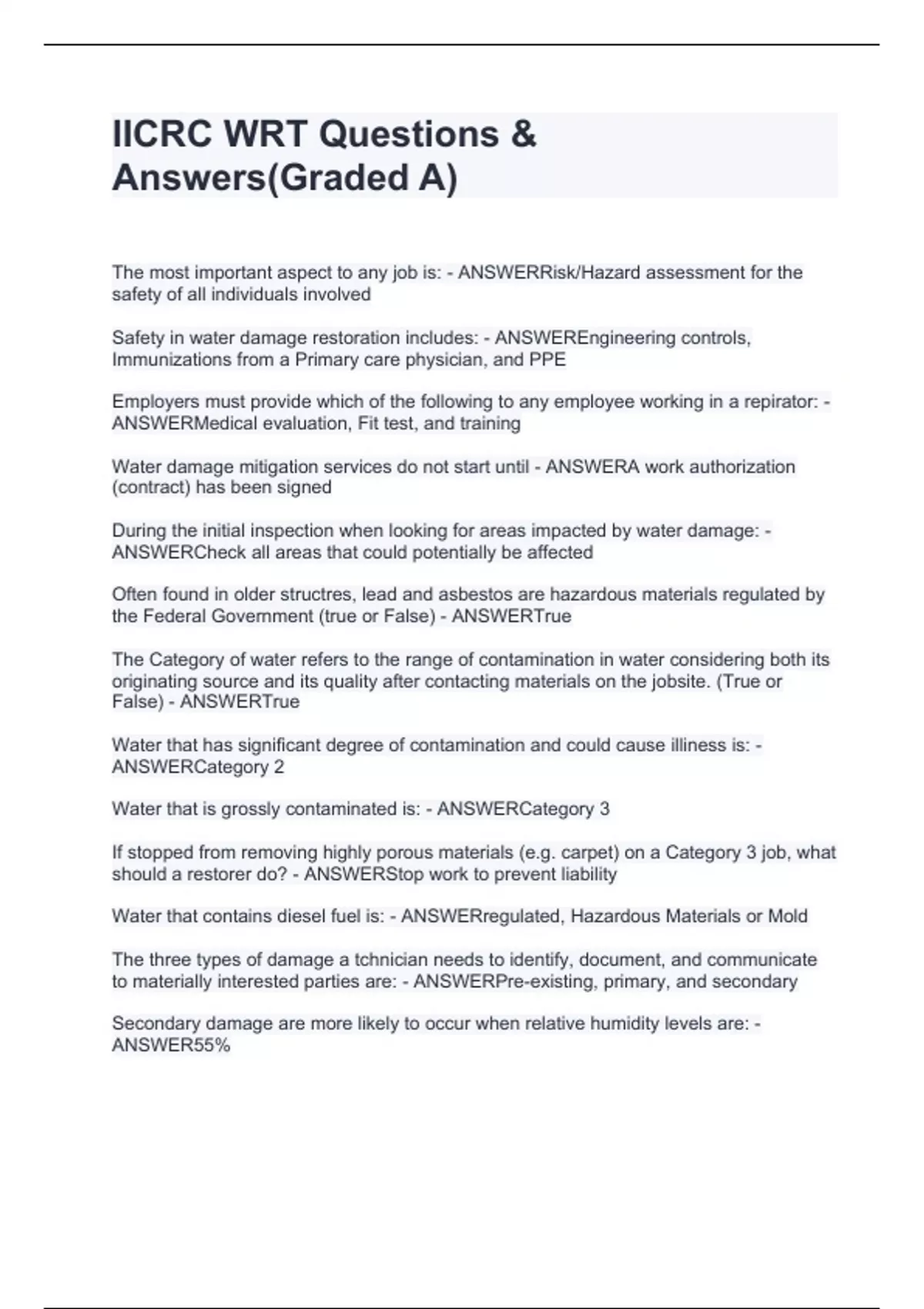 The most important aspect to any job is: - ANSWERRisk/Hazard assessment for the safety of all individuals involved Safety in water damage restoration includes: - ANSWEREngineering controls, Immunizations from a Primary care physician, and PPE Employers must provide which of the following to any employee working in a repirator: - ANSWERMedical evaluation, Fit test, and training Water damage mitigation services do not start until - ANSWERA work authorization (contract) has been signed During the initial inspection when looking for areas impacted by water damage: - ANSWERCheck all areas that could potentially be affected Often found in older structres, lead and asbestos are hazardous materials regulated by the Federal Government (true or False) - ANSWERTrue The Category of water refers to the range of contamination in water considering both its originating source and its quality after contacting materials on the jobsite. (True or False) - ANSWERTrue Water that has significant degree of contamination and could cause illiness is: - ANSWERCategory 2 Water that is grossly contaminated is: - ANSWERCategory 3 If stopped from removing highly porous materials (e.g. carpet) on a Category 3 job, what should a restorer do? - ANSWERStop work to prevent liability Water that contains diesel fuel is: - ANSWERregulated, Hazardous Materials or Mold The three types of damage a tchnician needs to identify, document, and communicate to materially interested parties are: - ANSWERPre-existing, primary, and secondary Secondary damage are more likely to occur when relative humidity levels are: - ANSWER55%