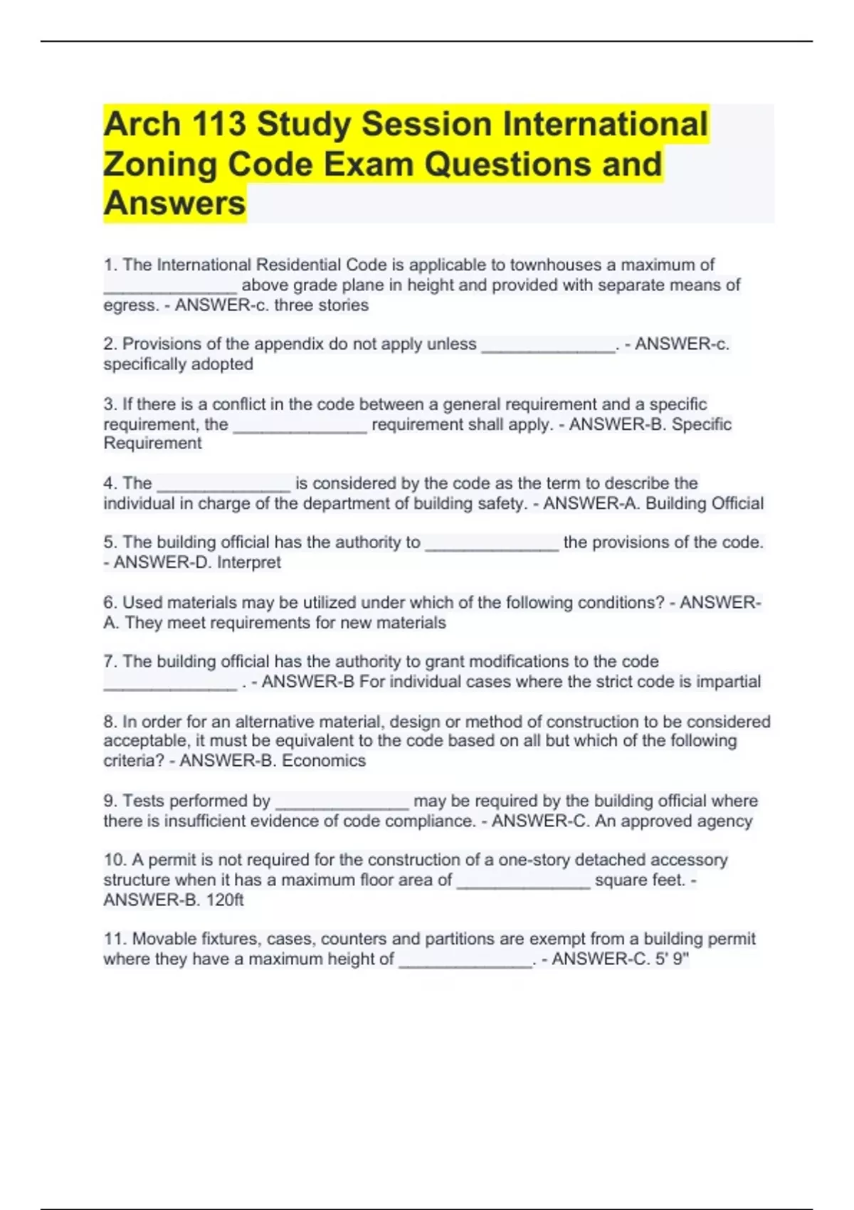 1. The International Residential Code is applicable to townhouses a maximum of ______________ above grade plane in height and provided with separate means of egress. - ANSWER-c. three stories 2. Provisions of the appendix do not apply unless ______________. - ANSWER-c. specifically adopted 3. If there is a conflict in the code between a general requirement and a specific requirement, the ______________ requirement shall apply. - ANSWER-B. Specific Requirement 4. The ______________ is considered by the code as the term to describe the individual in charge of the department of building safety. - ANSWER-A. Building Official 5. The building official has the authority to ______________ the provisions of the code. - ANSWER-D. Interpret 6. Used materials may be utilized under which of the following conditions? - ANSWER-A. They meet requirements for new materials 7. The building official has the authority to grant modifications to the code ______________ . - ANSWER-B For individual cases where the strict code is impartial 8. In order for an alternative material, design or method of construction to be considered acceptable, it must be equivalent to the code based on all but which of the following criteria? - ANSWER-B. Economics 9. Tests performed by ______________ may be required by the building official where there is insufficient evidence of code compliance. - ANSWER-C. An approved agency 10. A permit is not required for the construction of a one-story detached accessory structure when it has a maximum floor area of ______________ square feet. - ANSWER-B. 120ft 11. Movable fixtures, cases, counters and partitions are exempt from a building permit where they have a maximum height of ______________. - ANSWER-C. 5' 9''