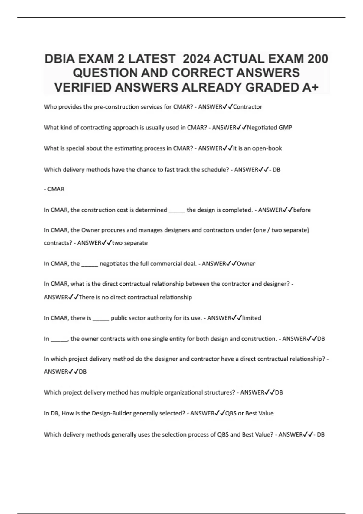 DBIA EXAM 2 LATEST 2024 ACTUAL EXAM 200 QUESTION AND CORRECT ANSWERS VERIFIED ANSWERS ALREADY GRADED A.p