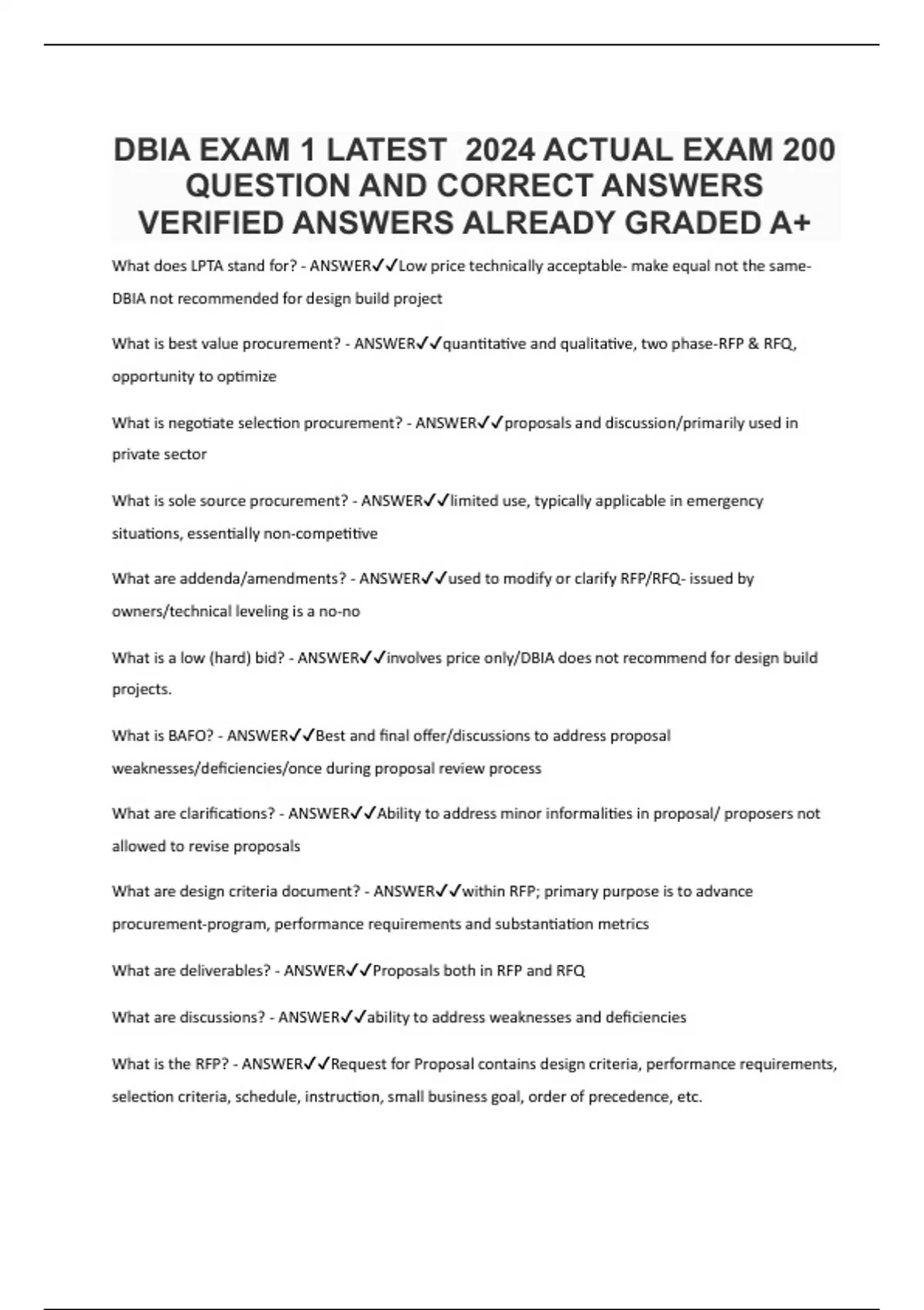 DBIA EXAM 1 LATEST 2024 ACTUAL EXAM 200 QUESTION AND CORRECT ANSWERS VERIFIED ANSWERS ALREADY GRADED A