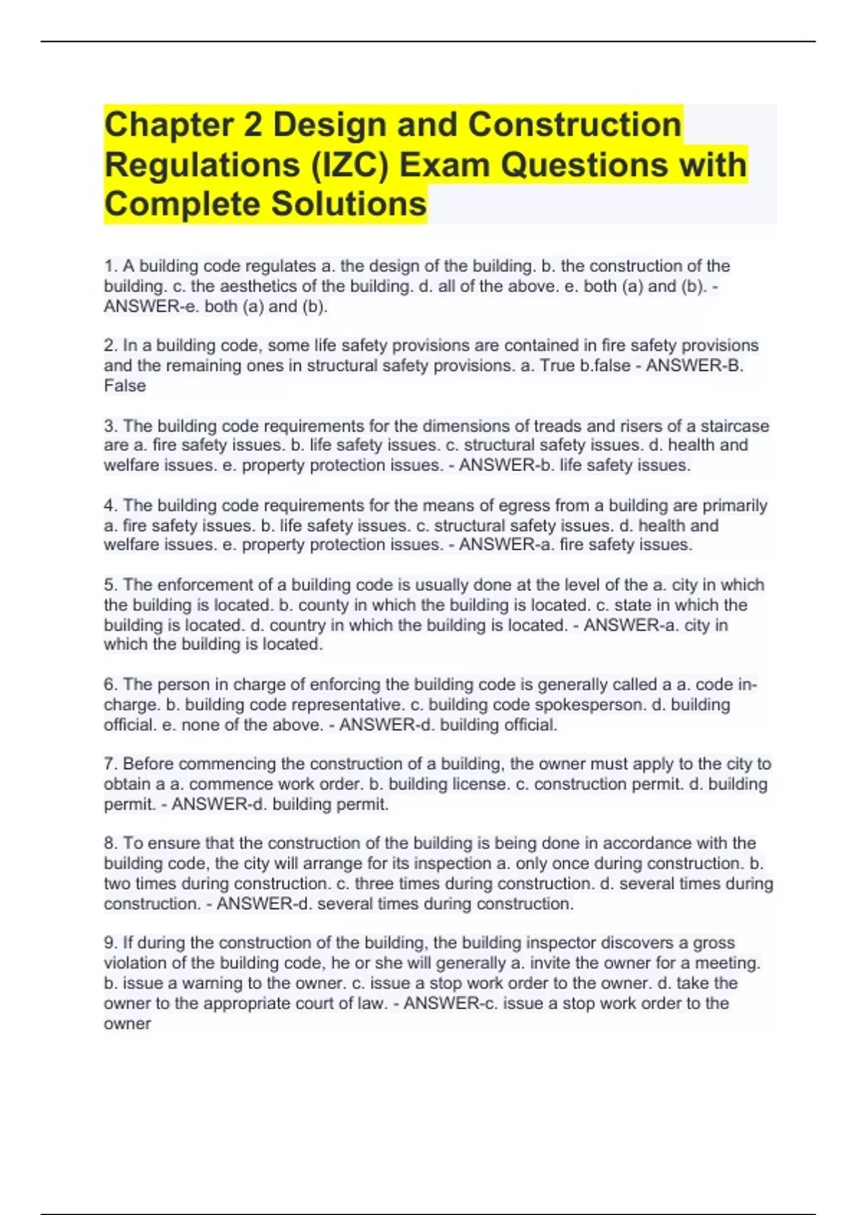 1. A building code regulates a. the design of the building. b. the construction of the building. c. the aesthetics of the building. d. all of the above. e. both (a) and (b). - ANSWER-e. both (a) and (b). 2. In a building code, some life safety provisions are contained in fire safety provisions and the remaining ones in structural safety provisions. a. True - ANSWER-B. False 3. The building code requirements for the dimensions of treads and risers of a staircase are a. fire safety issues. b. life safety issues. c. structural safety issues. d. health and welfare issues. e. property protection issues. - ANSWER-b. life safety issues. 4. The building code requirements for the means of egress from a building are primarily a. fire safety issues. b. life safety issues. c. structural safety issues. d. health and welfare issues. e. property protection issues. - ANSWER-a. fire safety issues. 5. The enforcement of a building code is usually done at the level of the a. city in which the building is located. b. county in which the building is located. c. state in which the building is located. d. country in which the building is located. - ANSWER-a. city in which the building is located. 6. The person in charge of enforcing the building code is generally called a a. code in-charge. b. building code representative. c. building code spokesperson. d. building official. e. none of the above. - ANSWER-d. building official. 7. Before commencing the construction of a building, the owner must apply to the city to obtain a a. commence work order. b. building license. c. construction permit. d. building permit. - ANSWER-d. building permit. 8. To ensure that the construction of the building is being done in accordance with the building code, the city will arrange for its inspection a. only once during construction. b. two times during construction. c. three times during construction. d. several times during construction. - ANSWER-d. several times during construction. 9. If during the construction of the building, the building inspector discovers a gross violation of the building code, he or she will generally a. invite the owner for a meeting. b. issue a warning to the owner. c. issue a stop work order to the owner. d. take the owner to the appropriate court of law. - ANSWER-c. issue a stop work order to the owner