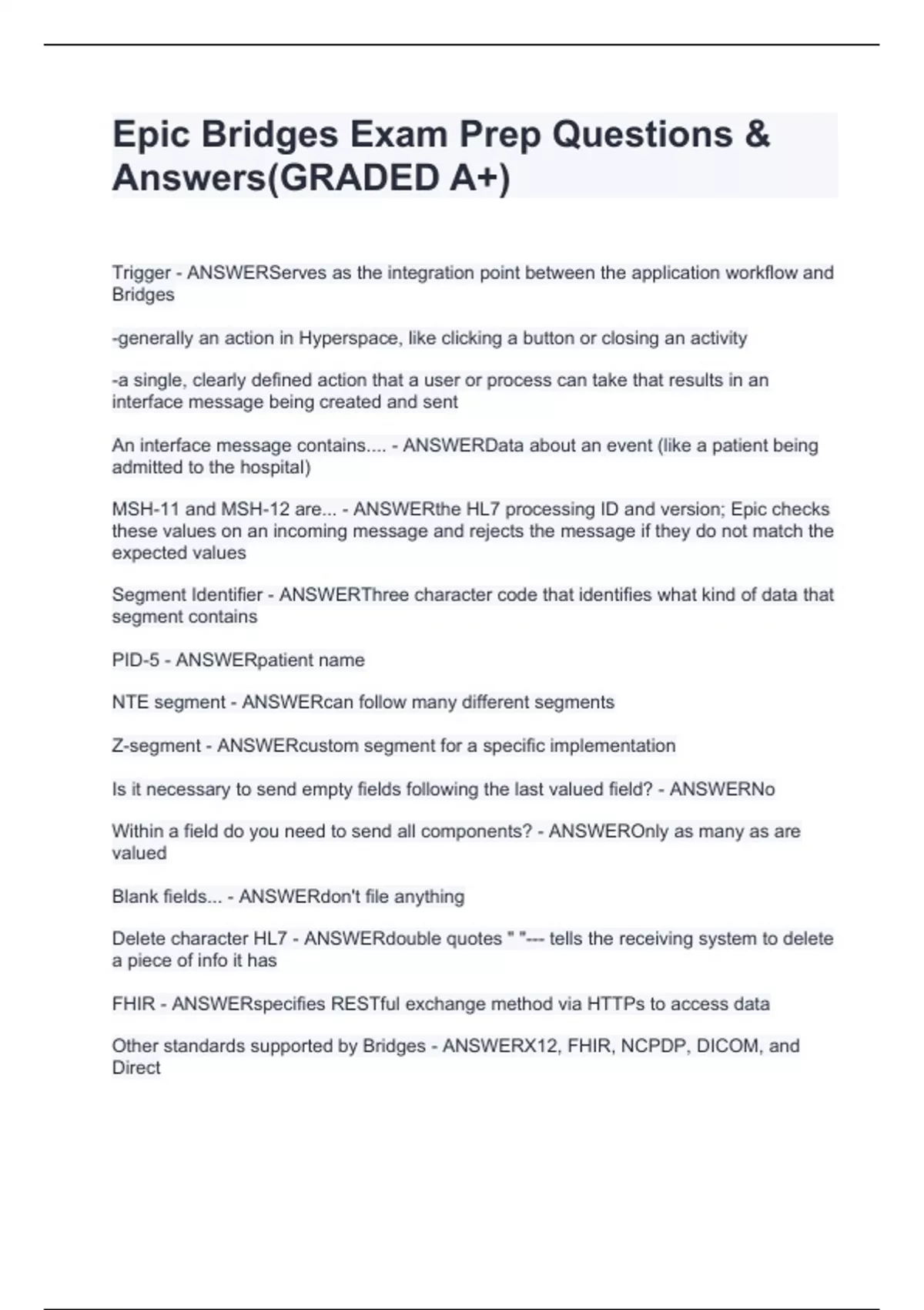Trigger - ANSWERServes as the integration point between the application workflow and Bridges -generally an action in Hyperspace, like clicking a button or closing an activity -a single, clearly defined action that a user or process can take that results in an interface message being created and sent An interface message contains.... - ANSWERData about an event (like a patient being admitted to the hospital) MSH-11 and MSH-12 are... - ANSWERthe HL7 processing ID and version; Epic checks these values on an incoming message and rejects the message if they do not match the expected values Segment Identifier - ANSWERThree character code that identifies what kind of data that segment contains PID-5 - ANSWERpatient name NTE segment - ANSWERcan follow many different segments Z-segment - ANSWERcustom segment for a specific implementation Is it necessary to send empty fields following the last valued field? - ANSWERNo Within a field do you need to send all components? - ANSWEROnly as many as are valued Blank fields... - ANSWERdon't file anything Delete character HL7 - ANSWERdouble quotes " "--- tells the receiving system to delete a piece of info it has FHIR - ANSWERspecifies RESTful exchange method via HTTPs to access data Other standards supported by Bridges - ANSWERX12, FHIR, NCPDP, DICOM, and Direct