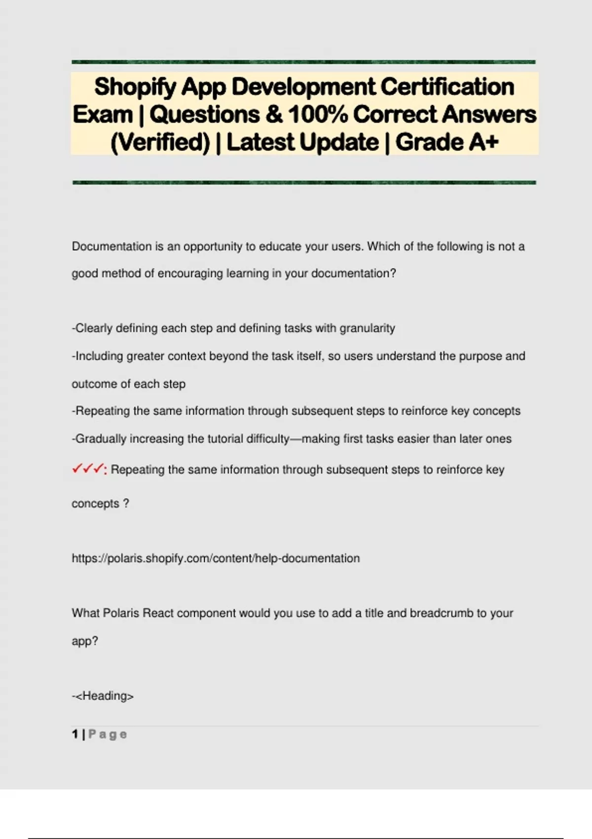 Documentation is an opportunity to educate your users. Which of the following is not a good method of encouraging learning in your documentation? -Clearly defining each step and defining tasks with granularity -Including greater context beyond the task itself, so users understand the purpose and outcome of each step -Repeating the same information through subsequent steps to reinforce key concepts -Gradually increasing the tutorial difficulty—making first tasks easier than later ones : Repeating the same information through subsequent steps to reinforce key concepts ? What Polaris React component would you use to add a title and breadcrumb to your app? -Heading 2 | P a g e -Tabs -Page -Link : Page ? The access token generated during OAuth can be used with both the REST and GraphQL Admin APIs.