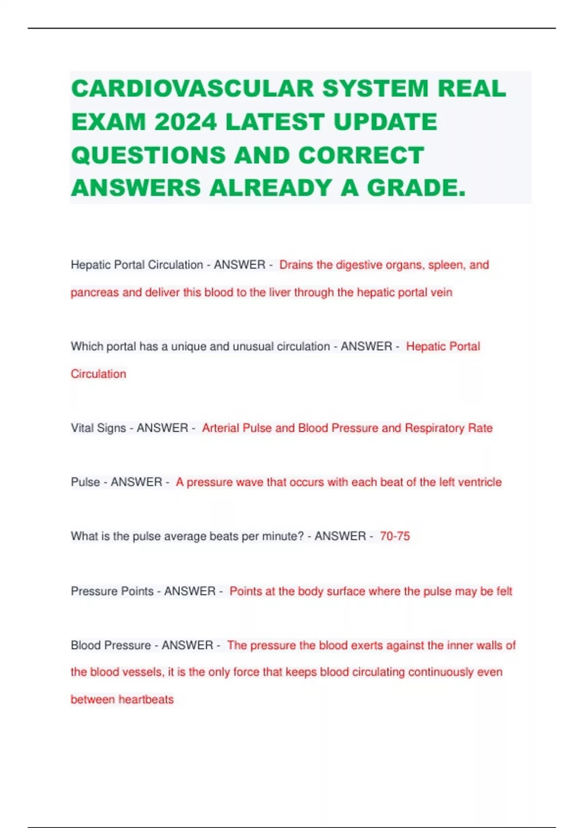 CARDIOVASCULAR SYSTEM REAL EXAM 2024 LATEST UPDATE QUESTIONS AND CORRECT ANSWERS ALREADY A GRADE. Hepatic Portal Circulation - ANSWER - Drains the digestive organs, spleen, and pancreas and deliver this blood to the liver through the hepatic portal vein Which portal has a unique and unusual circulation - ANSWER - Hepatic Portal Circulation Vital Signs - ANSWER - Arterial Pulse and Blood Pressure and Respiratory Rate Pulse - ANSWER - A pressure wave that occurs with each beat of the left ventricle What is the pulse average beats per minute? - ANSWER - 70-75