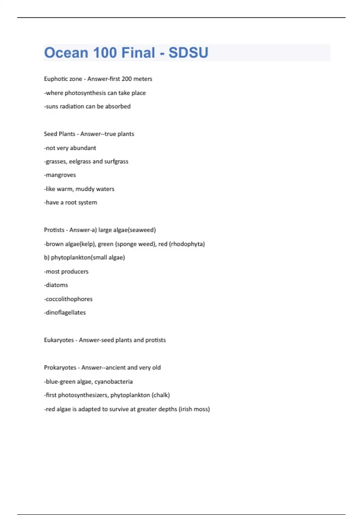 Euphotic zone - Answer-first 200 meters -where photosynthesis can take place -suns radiation can be absorbed Seed Plants - Answer--true plants -not very abundant -grasses, eelgrass and surfgrass -mangroves -like warm, muddy waters -have a root system Protists - Answer-a) large algae(seaweed) -brown algae(kelp), green (sponge weed), red (rhodophyta) b) phytoplankton(small algae) -most producers -diatoms -coccolithophores -dinoflagellates Eukaryotes - Answer-seed plants and protists Prokaryotes - Answer--ancient and very old -blue-green algae, cyanobacteria -first photosynthesizers, phytoplankton (chalk) -red algae is adapted to survive at greater depths (irish moss)regions of high productivity - Answer--polar regions -coasts -coral reefs polar regions - Answer--no thermocline -great amounts of sea life coasts - Answer--upwelling b/c eckman transport(winds moving water) -nutrients coming from land coral reefs - Answer-very productive regions of low productivity - Answer--subtropical gyres -far from coasts -water doesn't move up or down -no upwelling -very high thermocline energy flow - Answer--Producers -Consumers producers - Answer--all photosynthetic -autotrophs-self surviving (produce their own food) consumers - Answer--all animals -heterotrophs -must consume other organisms (can't stay alive if they don't) vertebrates - Answer-fishes, amphibians, reptiles, birds, and mammalsAdaptations to the Marine Environment - Answer-1. Swimming/buoyancy 2. Avoiding Predators 3. Gas Exchange 4. Adaptations of deep sea fishes Diffusion - Answer-there is a higher concentration of C02 in the water as the fish breathes there is a lower concentration of C02 in the blood Bony fishes - Answer--osteichthyes -most successful group in the oceans Placoderms - Answer--armored jawed fishes -400 mya -some of the oldest fishes Cartilaginous fish - Answer--chondrichthyes -sharks, rays -been around for ~300 million years Sharks - Answer-1) 80% of all species are not dangerous 2) Remarkable senses: lateral line 3) Very successful, well adapted fishes Whale Shark - Answer--largest fish (15meters ~45 feet long) -feeds on plankton and krill Characteristics of ALL Mammals - Answer--mammary glands -hair/fur -live youngMarine Mammals - Answer--streamline body -high metabolism -large (blue whale is largest) 3 orders of Marine Mammals - Answer-1) Cetacea 2) Pinnipedia 3) Sirenia Cetacea - Answer--whales, dolphins, porpoises -intelligent and social -whales largest -porpoises smallest -evolved from hoofed land mammals -2 main groups A)Odontoceti- toothed whales B)Mysticeti- baleen whales