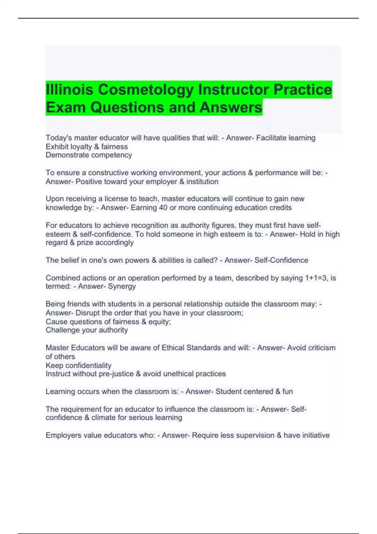 Illinois Cosmetology Instructor Practice Exam Questions and Answers- Graded A