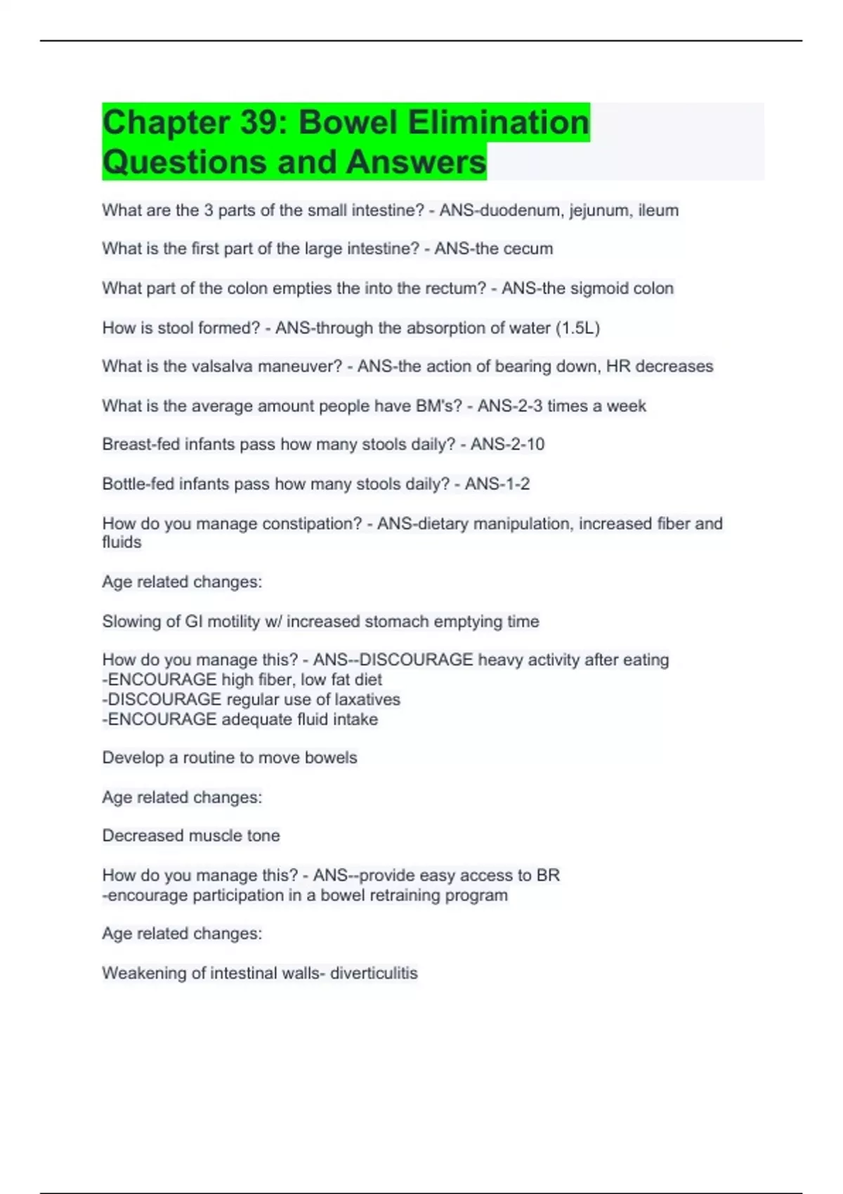 Chapter 39 Bowel Elimination Questions and Answer Graded A