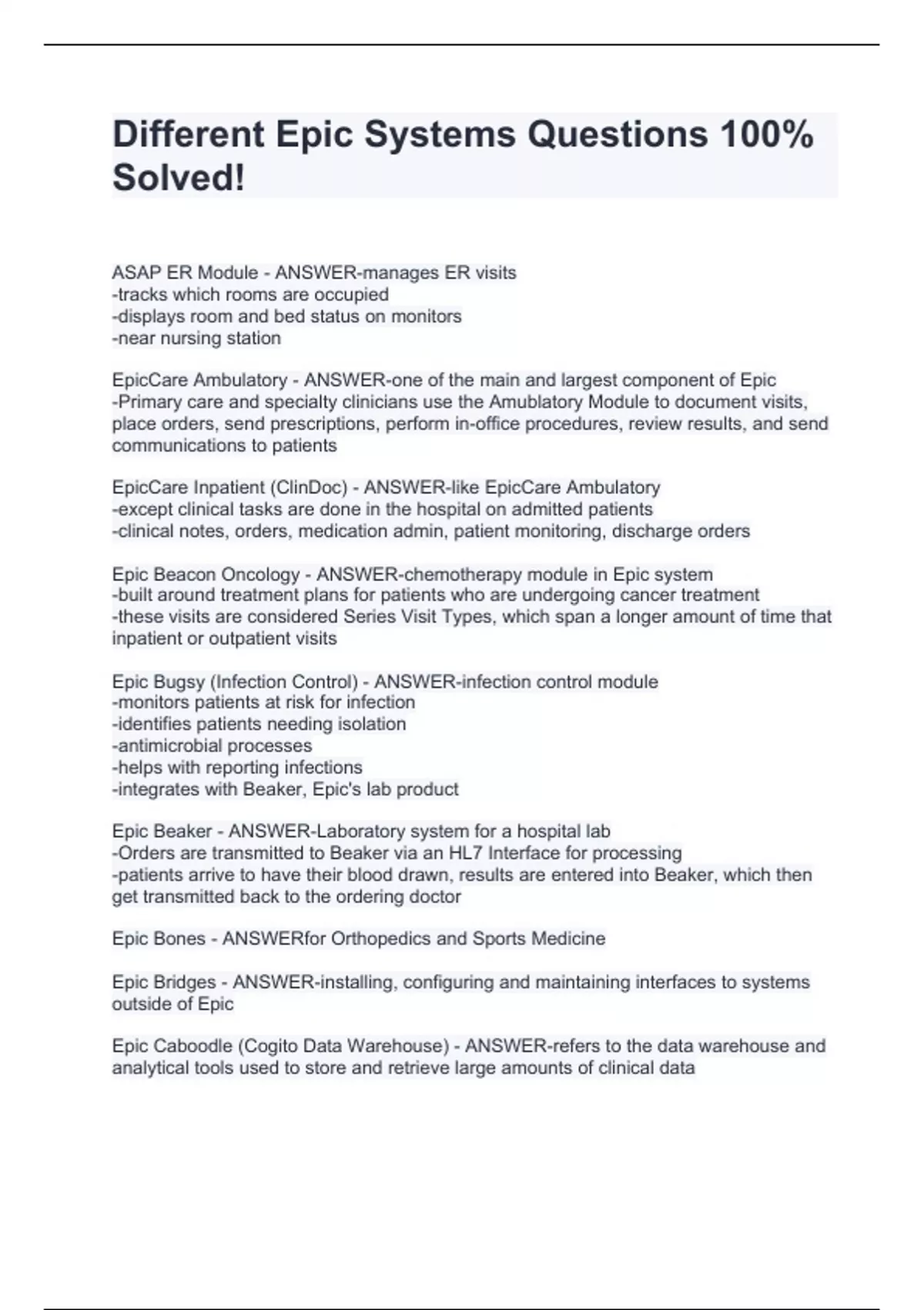 ASAP ER Module - ANSWER-manages ER visits -tracks which rooms are occupied -displays room and bed status on monitors -near nursing station EpicCare Ambulatory - ANSWER-one of the main and largest component of Epic -Primary care and specialty clinicians use the Amublatory Module to document visits, place orders, send prescriptions, perform in-office procedures, review results, and send communications to patients EpicCare Inpatient (ClinDoc) - ANSWER-like EpicCare Ambulatory -except clinical tasks are done in the hospital on admitted patients -clinical notes, orders, medication admin, patient monitoring, discharge orders Epic Beacon Oncology - ANSWER-chemotherapy module in Epic system -built around treatment plans for patients who are undergoing cancer treatment -these visits are considered Series Visit Types, which span a longer amount of time that inpatient or outpatient visits Epic Bugsy (Infection Control) - ANSWER-infection control module -monitors patients at risk for infection -identifies patients needing isolation -antimicrobial processes -helps with reporting infections -integrates with Beaker, Epic's lab product Epic Beaker - ANSWER-Laboratory system for a hospital lab -Orders are transmitted to Beaker via an HL7 Interface for processing -patients arrive to have their blood drawn, results are entered into Beaker, which then get transmitted back to the ordering doctor Epic Bones - ANSWERfor Orthopedics and Sports Medicine Epic Bridges - ANSWER-installing, configuring and maintaining interfaces to systems outside of Epic Epic Caboodle (Cogito Data Warehouse) - ANSWER-refers to the data warehouse and analytical tools used to store and retrieve large amounts of clinical data