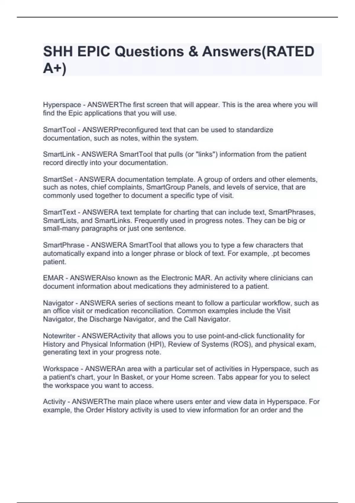 Hyperspace - ANSWERThe first screen that will appear. This is the area where you will find the Epic applications that you will use. SmartTool - ANSWERPreconfigured text that can be used to standardize documentation, such as notes, within the system. SmartLink - ANSWERA SmartTool that pulls (or "links") information from the patient record directly into your documentation. SmartSet - ANSWERA documentation template. A group of orders and other elements, such as notes, chief complaints, SmartGroup Panels, and levels of service, that are commonly used together to document a specific type of visit. SmartText - ANSWERA text template for charting that can include text, SmartPhrases, SmartLists, and SmartLinks. Frequently used in progress notes. They can be big or small-many paragraphs or just one sentence. SmartPhrase - ANSWERA SmartTool that allows you to type a few characters that automatically expand into a longer phrase or block of text. For example, .pt becomes patient. EMAR - ANSWERAlso known as the Electronic MAR. An activity where clinicians can document information about medications they administered to a patient. Navigator - ANSWERA series of sections meant to follow a particular workflow, such as an office visit or medication reconciliation. Common examples include the Visit Navigator, the Discharge Navigator, and the Call Navigator. Notewriter - ANSWERActivity that allows you to use point-and-click functionality for History and Physical Information (HPI), Review of Systems (ROS), and physical exam, generating text in your progress note. Workspace - ANSWERAn area with a particular set of activities in Hyperspace, such as a patient's chart, your In Basket, or your Home screen. Tabs appear for you to select the workspace you want to access. Activity - ANSWERThe main place where users enter and view data in Hyperspace. For
