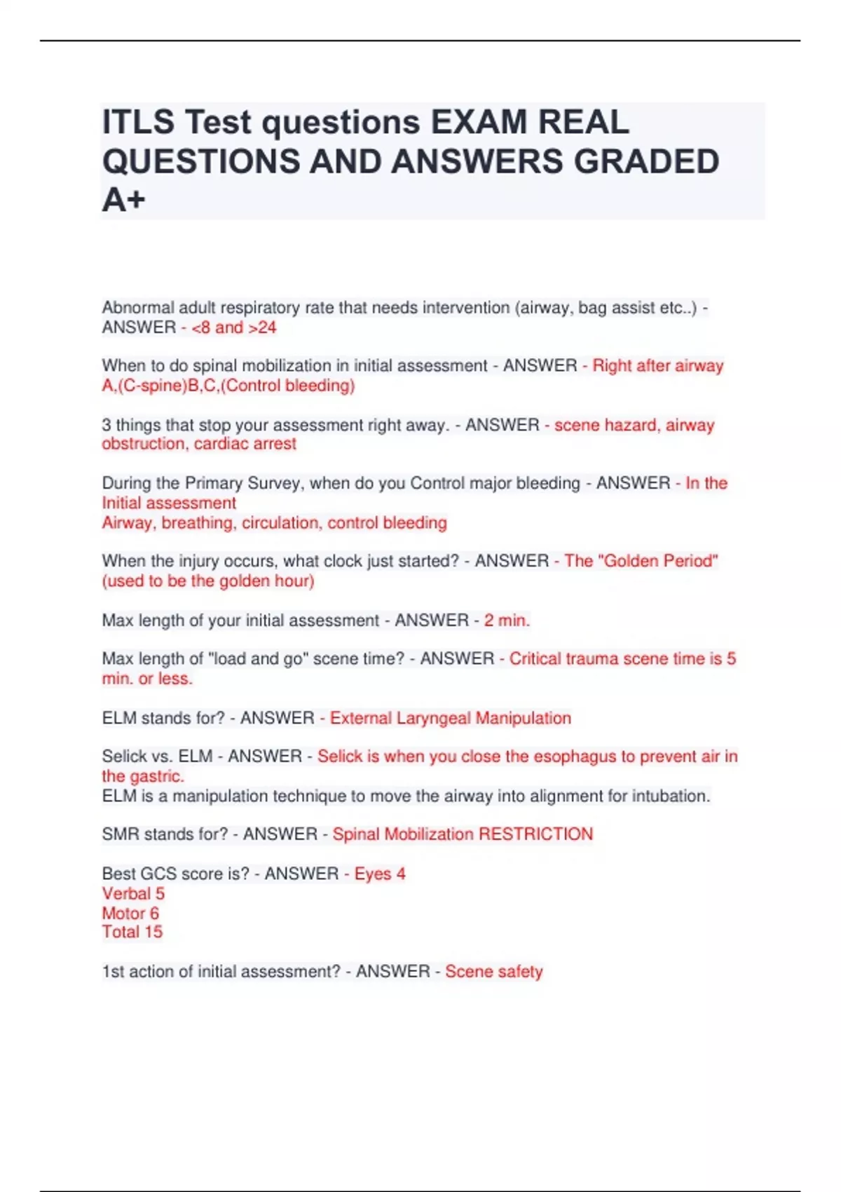 ITLS Test questions EXAM REAL QUESTIONS AND ANSWERS GRADED A+