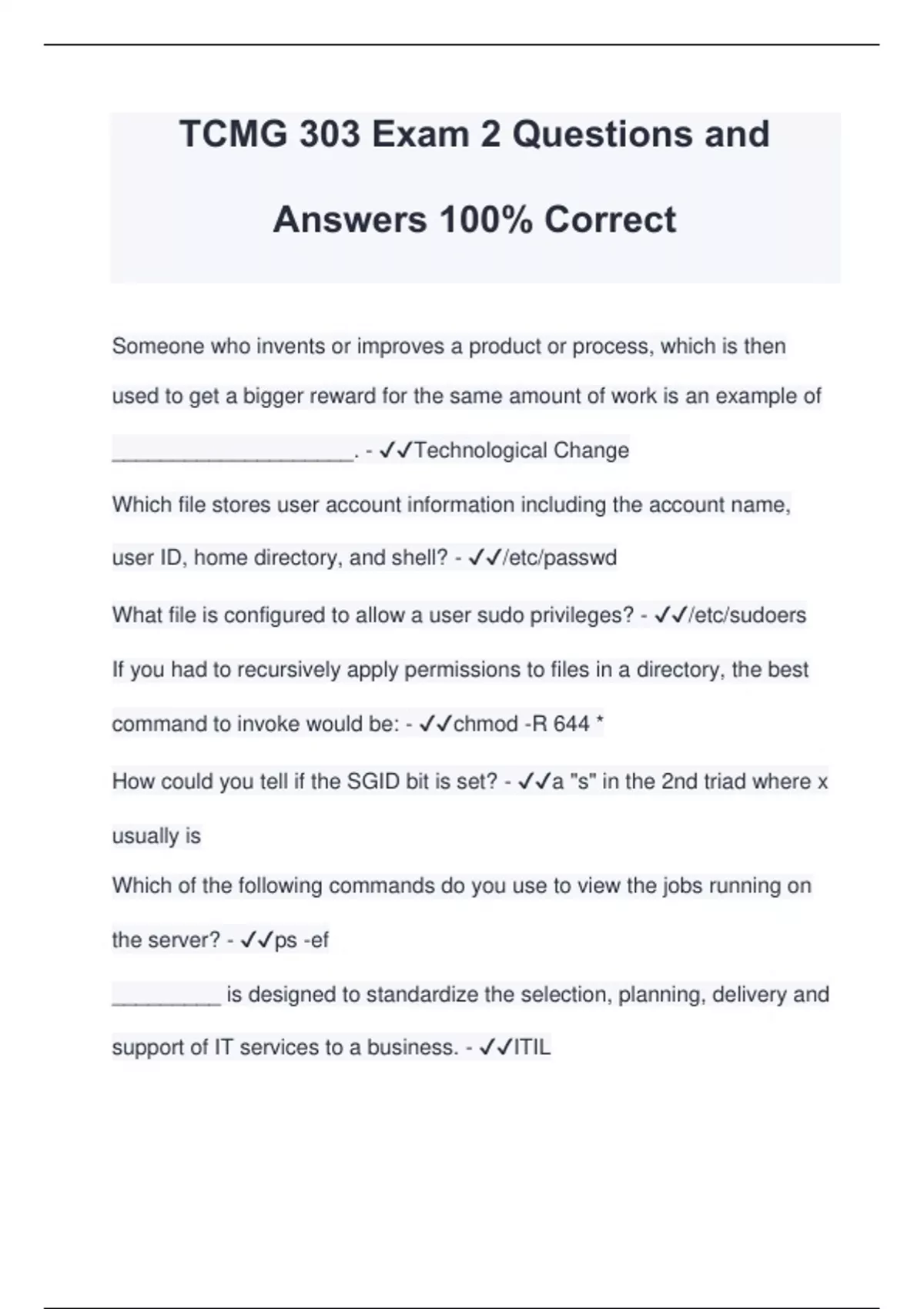 TCMG 303 Exam 2 Questions and Answers 100% Correct Someone who invents or improves a product or process, which is then used to get a bigger reward for the same amount of work is an example of ____________________. - Technological Change Which file stores user account information including the account name, user ID, home directory, and shell? - /etc/passwd What file is configured to allow a user sudo privileges? - /etc/sudoers If you had to recursively apply permissions to files in a directory, the best command to invoke would be: - chmod -R 644 * How could you tell if the SGID bit is set? - a "s" in the 2nd triad where x usually is Which of the following commands do you use to view the jobs running on the server? - ps -ef _________ is designed to standardize the selection, planning, delivery and support of IT services to a business. - ITIL Which directory would the system configuration's password file be stored in? - /etc