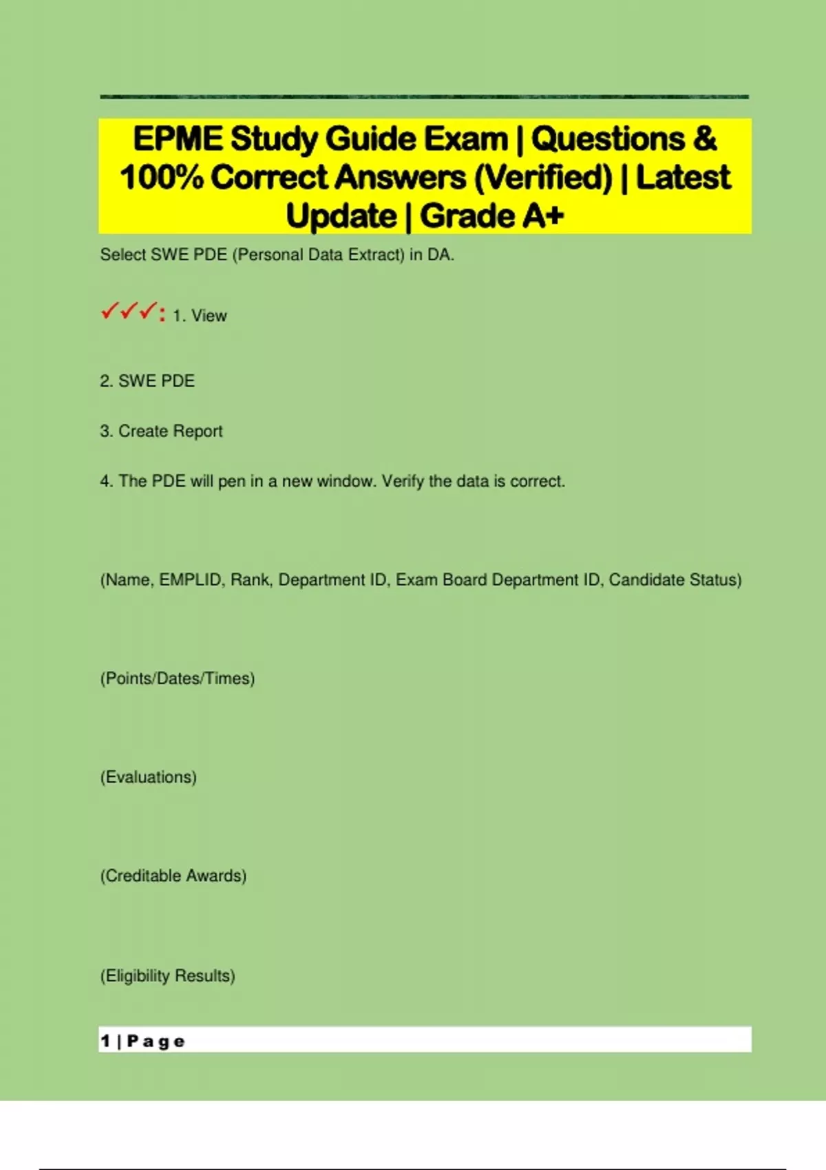 Select SWE PDE (Personal Data Extract) in DA. : 1. View 2. SWE PDE 3. Create Report 4. The PDE will pen in a new window. Verify the data is correct. (Name, EMPLID, Rank, Department ID, Exam Board Department ID, Candidate Status) (Points/Dates/Times) (Evaluations) (Creditable Awards) (Eligibility Results) 2 | P a g e (PDE Verification)