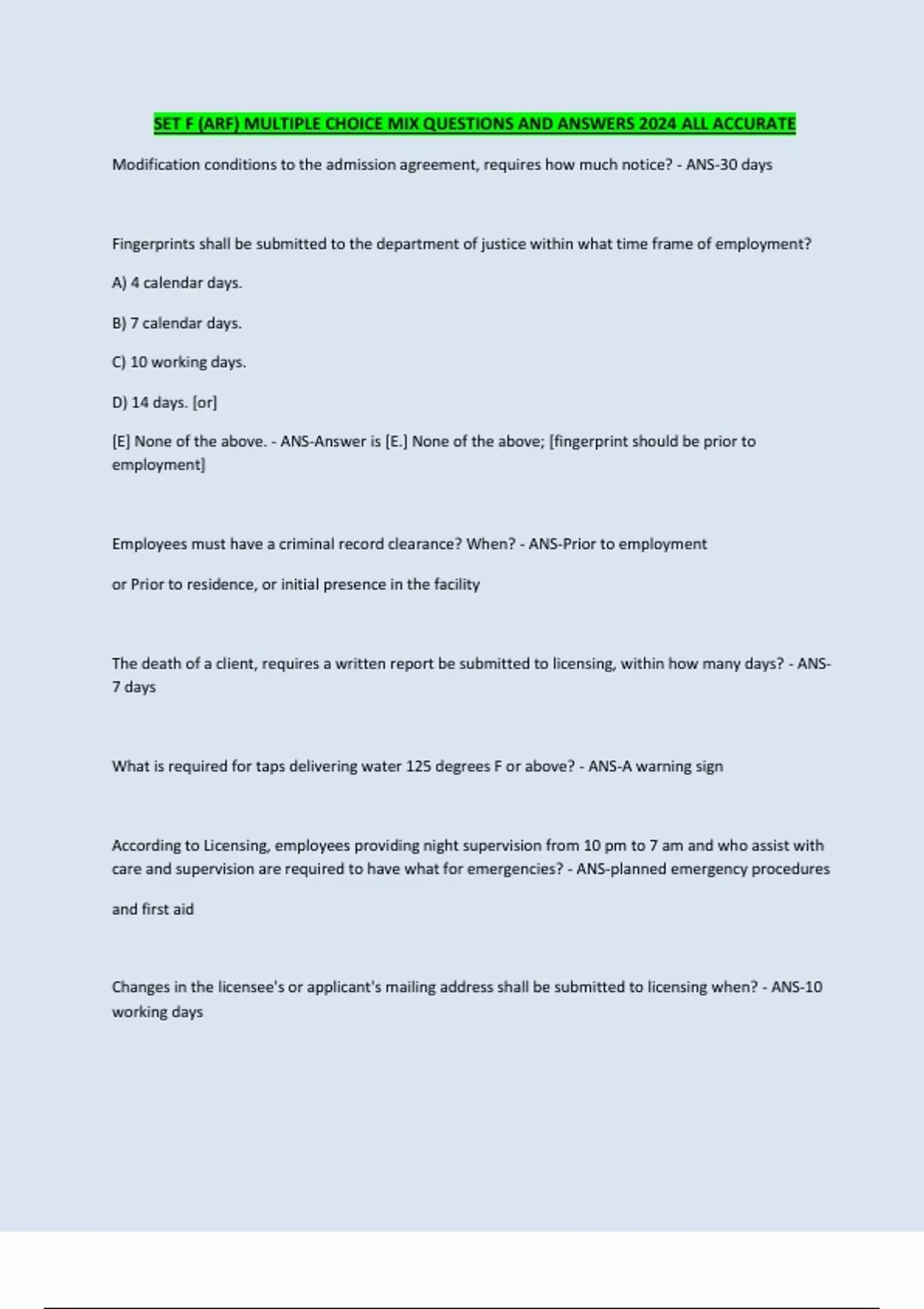 SET F (ARF) MULTIPLE CHOICE MIX QUESTIONS AND ANSWERS 2024 ALL ACCURATE Modification conditions to the admission agreement, requires how much notice? - ANS-30 days Fingerprints shall be submitted to the department of justice within what time frame of employment? A) 4 calendar days. B) 7 calendar days. C) 10 working days. D) 14 days. [or] [E] None of the above. - ANS-Answer is [E.] None of the above; [fingerprint should be prior to employment] Employees must have a criminal record clearance? When? - ANS-Prior to employment or Prior to residence, or initial presence in the facility The death of a client, requires a written report be submitted to licensing, within how many days? - ANS7 days What is required for taps delivering water 125 degrees F or above? - ANS-A warning sign According to Licensing, employees providing night supervision from 10 pm to 7 am and who assist with care and supervision are required to have what for emergencies? - ANS-planned emergency procedures and first aid Changes in the licensee's or applicant's mailing address shall be submitted to licensing when? - ANS-10 working days TB test must be performed on facility staff. What are the time frames? - ANS-No more than 1 year prior to, or 7 days after The client may be given a 30-day written notice of eviction for non-payment of the rate, within how many days of the due date? - ANS-10 days If a licensee dies, an adult relative, who has control of the property, shall be allowed to continue the operation of the facility, under what approval? - ANS-Emergency approval to operate; or [E]A[O] Casts and braces are examples of, what? - ANS-Postural supports Licensing has the authority to inspect what part of the facility? - ANS-The entire facility In lieu of locked storage of firearms, what can the licensee do? - ANS-Use trigger locks or remove the firing pin What size facility shall post the license in a prominent location? - ANS-7 or larger Supply of staple non-perishable foods, for a minimum of how many days, shall be maintained? - ANSOne week An emergency approval to operate is for not more than? - ANS-60 days The temperature in a client's room should be heated to at least? A) 78 degrees. B) 80 degrees. [or] C) 68 degrees. - ANS...