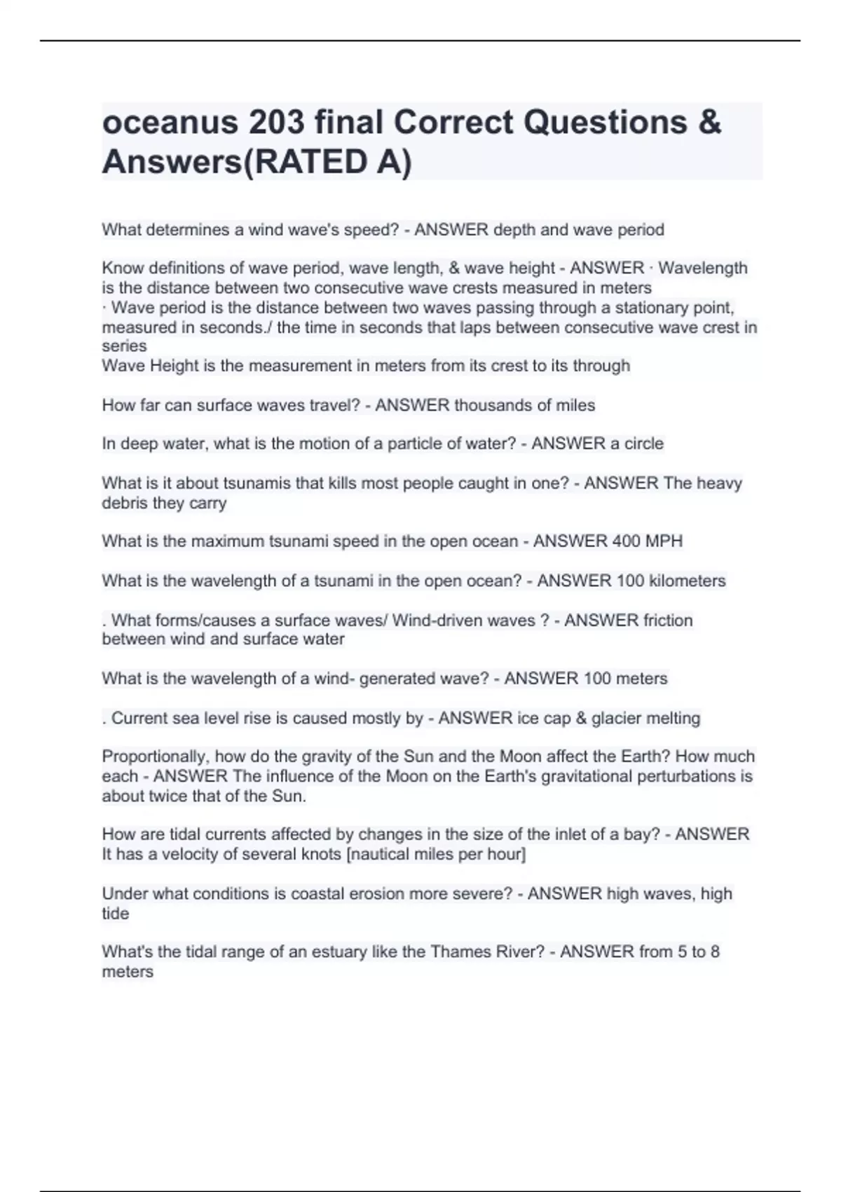 What determines a wind wave's speed? - ANSWER depth and wave period Know definitions of wave period, wave length, & wave height - ANSWER · Wavelength is the distance between two consecutive wave crests measured in meters · Wave period is the distance between two waves passing through a stationary point, measured in seconds./ the time in seconds that laps between consecutive wave crest in series Wave Height is the measurement in meters from its crest to its through How far can surface waves travel? - ANSWER thousands of miles In deep water, what is the motion of a particle of water? - ANSWER a circle What is it about tsunamis that kills most people caught in one? - ANSWER The heavy debris they carry What is the maximum tsunami speed in the open ocean