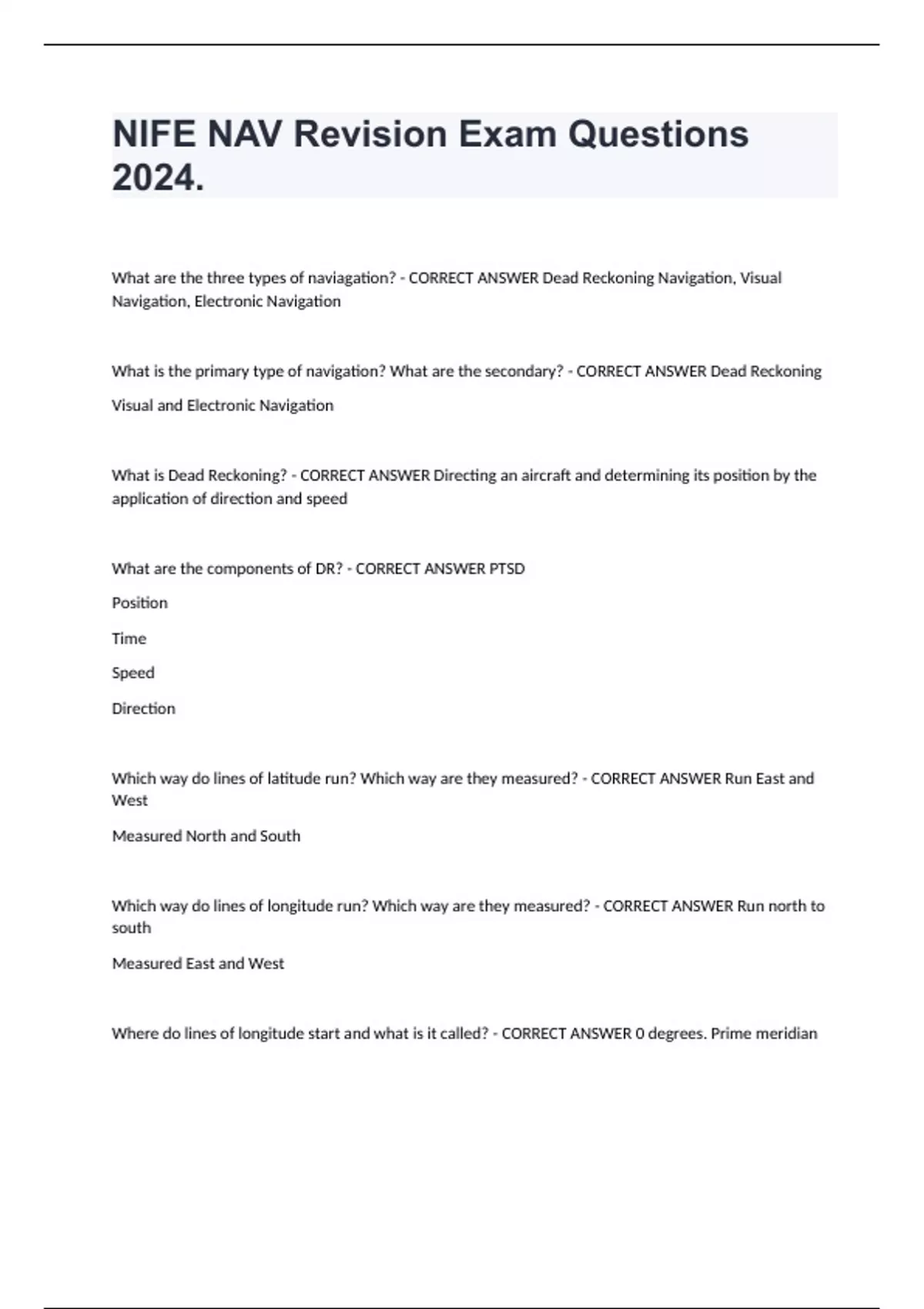 NIFE NAV Revision Exam Questions 2024. What are the three types of naviagation? - CORRECT ANSWER Dead Reckoning Navigation, Visual Navigation, Electronic Navigation What is the primary type of navigation? What are the secondary? - CORRECT ANSWER Dead Reckoning Visual and Electronic Navigation What is Dead Reckoning? - CORRECT ANSWER Directing an aircraft and determining its position by the application of direction and speed What are the components of DR? - CORRECT ANSWER PTSD Position Time Speed Direction Which way do lines of latitude run? Which way are they measured? - CORRECT ANSWER Run East and West Measured North and South Which way do lines of longitude run? Which way are they measured? - CORRECT ANSWER Run north to south Measured East and West Where do lines of longitude start and what is it called? - CORRECT ANSWER 0 degrees. Prime meridian