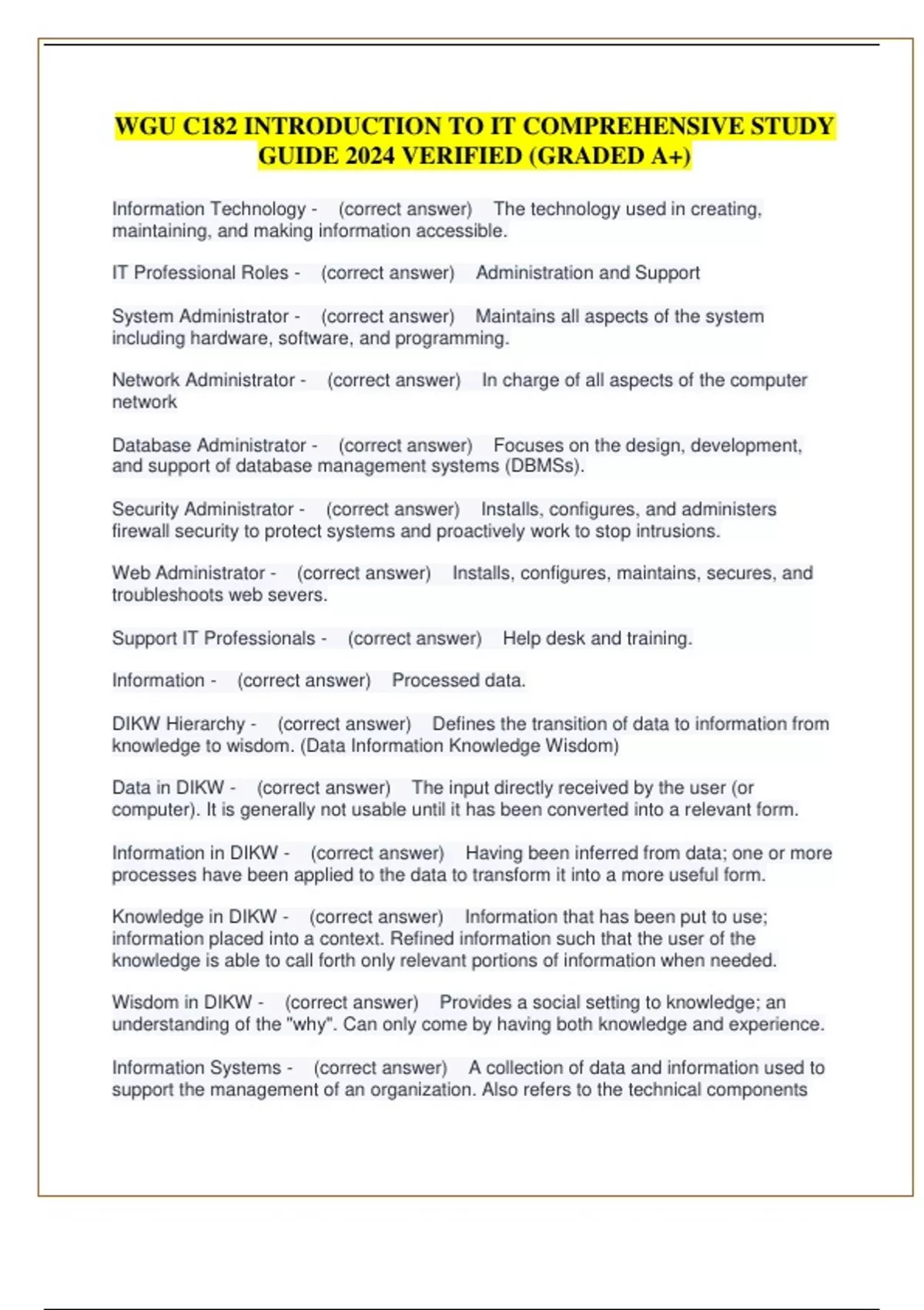 WGU C182 INTRODUCTION TO IT COMPREHENSIVE STUDY GUIDE 2024 VERIFIED (GRADED A+)