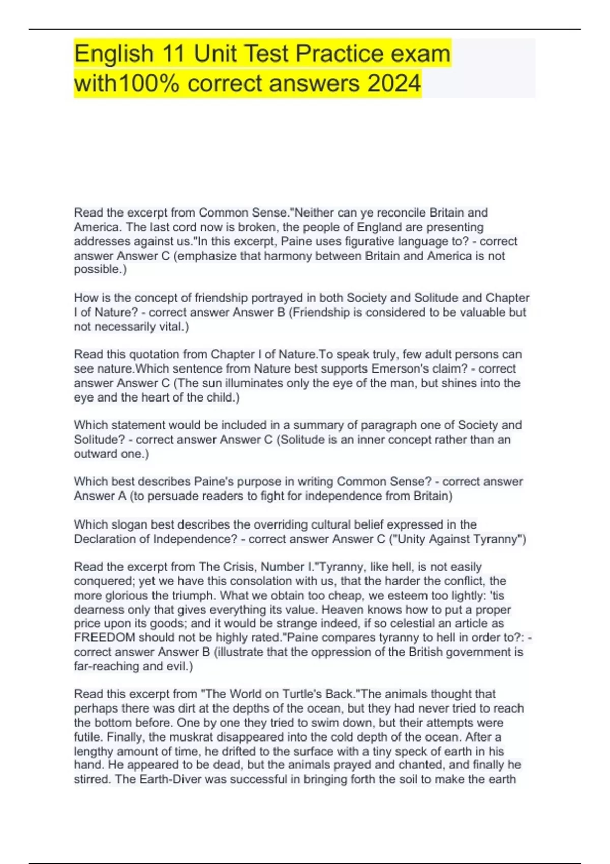 Read the excerpt from Common Sense."Neither can ye reconcile Britain and America. The last cord now is broken, the people of England are presenting addresses against us."In this excerpt, Paine uses figurative language to? - correct answer Answer C (emphasize that harmony between Britain and America is not possible.) How is the concept of friendship portrayed in both Society and Solitude and Chapter I of Nature? - correct answer Answer B (Friendship is considered to be valuable but not necessarily vital.) Read this quotation from Chapter I of Nature.To speak truly, few adult persons can see nature.Which sentence from Nature best supports Emerson's claim? - correct answer Answer C (The sun illuminates only the eye of the man, but shines into the eye and the heart of the child.) Which statement would be included in a summary of paragraph one of Society and Solitude? - correct answer Answer C (Solitude is an inner concept rather than an outward one.) Which best describes Paine's purpose in writing Common Sense? - correct answer Answer A (to persuade readers to fight for independence from Britain) Which slogan best describes the overriding cultural belief expressed in the Declaration of Independence? - correct answer Answer C ("Unity Against Tyranny") Read the excerpt from The Crisis, Number I."Tyranny, like hell, is not easily conquered; yet we have this consolation with us, that the harder the conflict, the more glorious the triumph. What we obtain too cheap, we esteem too lightly: 'tis dearness only that gives everything its value. Heaven knows how to put a proper price upon its goods; and it would be strange indeed, if so celestial an article as FREEDOM should not be highly rated."Paine compares tyranny to hell in order to?: - correct answer Answer B (illustrate that the oppression of the British government is far-reaching and evil.) Read this excerpt from "The World on Turtle's Back."The animals thought that perhaps there was dirt at the depths of the ocean, but they had never tried to reach the bottom before. One by one they tried to swim down, but their attempts were futile. Finally, the muskrat disappeared into the cold depth of the ocean. After a lengthy amount of time, he drifted to the surface with a tiny speck of earth in his hand. He appeared to be dead, but the animals prayed and chanted, and finally he stirred. The Earth-Diver was successful in bringing forth the soil to make the earth grow.Based on this excerpt, which character trait was valued by the Iroquois? - correct answer Answer A (courage) Read this excerpt from "The World on Turtle's Back."When the girl awoke, she knew that she would bear twins. Even before they were born, there was contention between the twins. There was no peace between these two brothers. When it was time for them to be born, the right-handed twin wanted to be born in the normal way. The left-handed twin saw light in the other direction and was determined to be born through his mother's mouth or nose. In his attempt to be born in the opposite direction, he killed his mother.Based on this excerpt, it is reasonable to conclude that?: - correct answer Answer A (the brothers were opposites and would always be in conflict.) Which best describes the conclusion of the Declaration of Independence? - correct answer Answer D (The colonies are no longer loyal to Britain's tyrannical rule.) Read the quotation from "Song of Myself."You will hardly know who I am or what I mean,But I shall be good health to you nevertheless,And filter and fibre your blood.Failing to fetch me at first keep encouraged,Missing me one place search another,I stop somewhere waiting for you.Which statement best summarizes the theme that these lines suggest? - correct answer Answer B (The self is complex and an integral part of nature.) Read the statement.The government of England is subjecting the American colonists to laws that take away their unalienable rights.This statement is the Declaration of Independence's?: - correct answer Answer B (minor premise) Read the third stanza of "Song of Myself."My tongue, every atom of my blood, form'd from this soil, this air,Born here of parents born here from parents the same, and their parents the same,I, now thirty-seven years old in perfect health begin,Hoping to cease not till death.Which statement best describes the effect of the language in this stanza? - correct answer Answer C (It establishes that the speaker of the poem will be frank and honest.) In "Because I Could Not Stop for Death," what is the significance of the phrase "[Death] knew no haste"? - correct answer Answer D (The phrase characterizes Death as being removed from human concerns.) When Emerson states, "It by no means follows that we are not fit for society, because soirees are tedious," in Society and Solitude, how does he support his statement? - correct answer Answer C (He suggests that a person has one conception of one's self when in a group and another when with just one other person.)