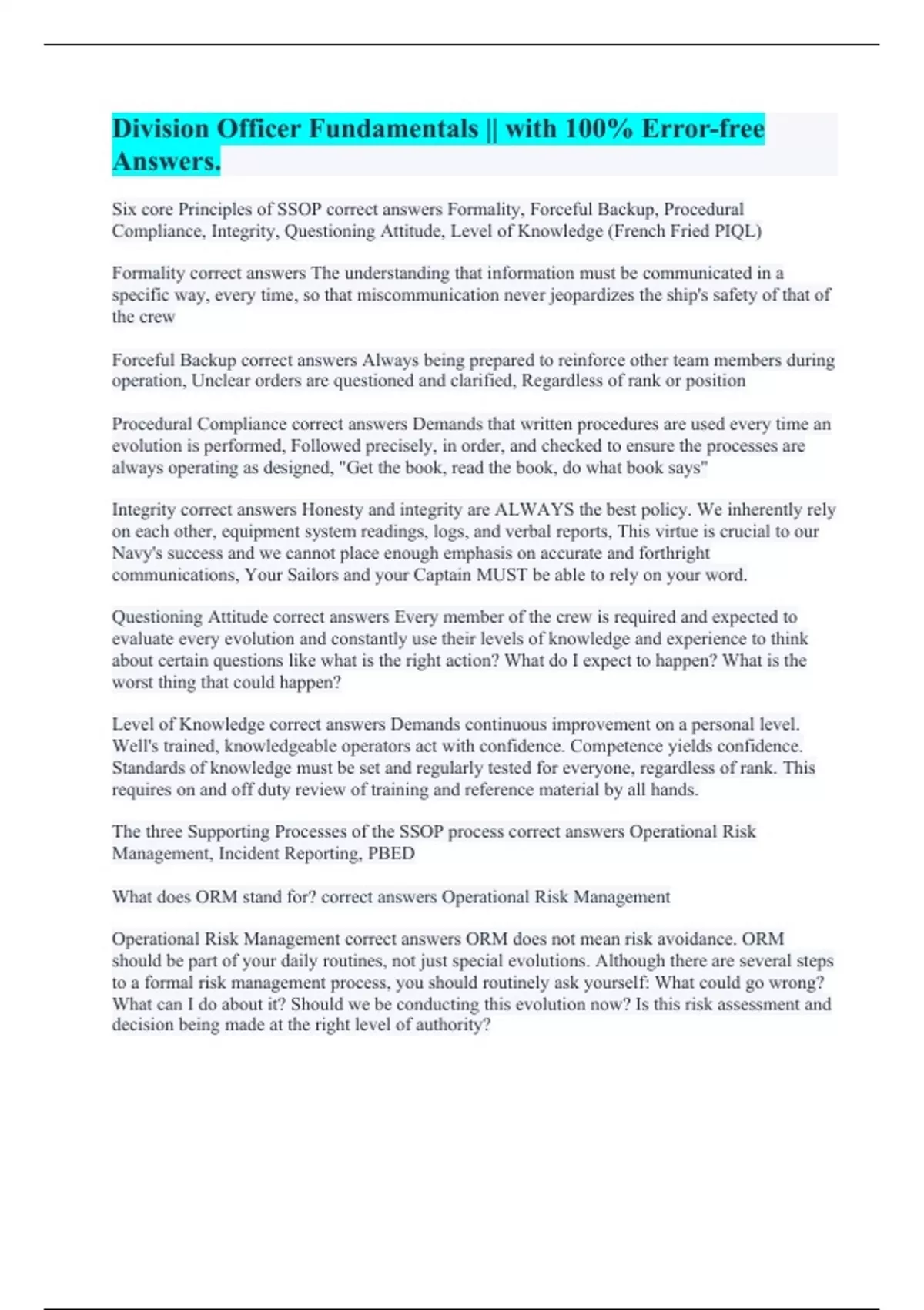 Six core Principles of SSOP correct answers Formality, Forceful Backup, Procedural Compliance, Integrity, Questioning Attitude, Level of Knowledge (French Fried PIQL) Formality correct answers The understanding that information must be communicated in a specific way, every time, so that miscommunication never jeopardizes the ship's safety of that of the crew Forceful Backup correct answers Always being prepared to reinforce other team members during operation, Unclear orders are questioned and clarified, Regardless of rank or position Procedural Compliance correct answers Demands that written procedures are used every time an evolution is performed, Followed precisely, in order, and checked to ensure the processes are always operating as designed, "Get the book, read the book, do what book says" Integrity correct answers Honesty and integrity are ALWAYS the best policy. We inherently rely on each other, equipment system readings, logs, and verbal reports, This virtue is crucial to our Navy's success and we cannot place enough emphasis on accurate and forthright communications, Your Sailors and your Captain MUST be able to rely on your word. Questioning Attitude correct answers Every member of the crew is required and expected to evaluate every evolution and constantly use their levels of knowledge and experience to think about certain questions like what is the right action? What do I expect to happen? What is the worst thing that could happen? Level of Knowledge correct answers Demands continuous improvement on a personal level. Well's trained, knowledgeable operators act with confidence. Competence yields confidence. Standards of knowledge must be set and regularly tested for everyone, regardless of rank. This requires on and off duty review of training and reference material by all hands. The three Supporting Processes of the SSOP process correct answers Operational Risk Management, Incident Reporting, PBED What does ORM stand for? correct answers Operational Risk Management Operational Risk Management correct answers ORM does not mean risk avoidance. ORM should be part of your daily routines, not just special evolutions. Although there are several steps to a formal risk management process, you should routinely ask yourself: What could go wrong? What can I do about it? Should we be conducting this evolution now? Is this risk assessment and decision being made at the right level of authority?