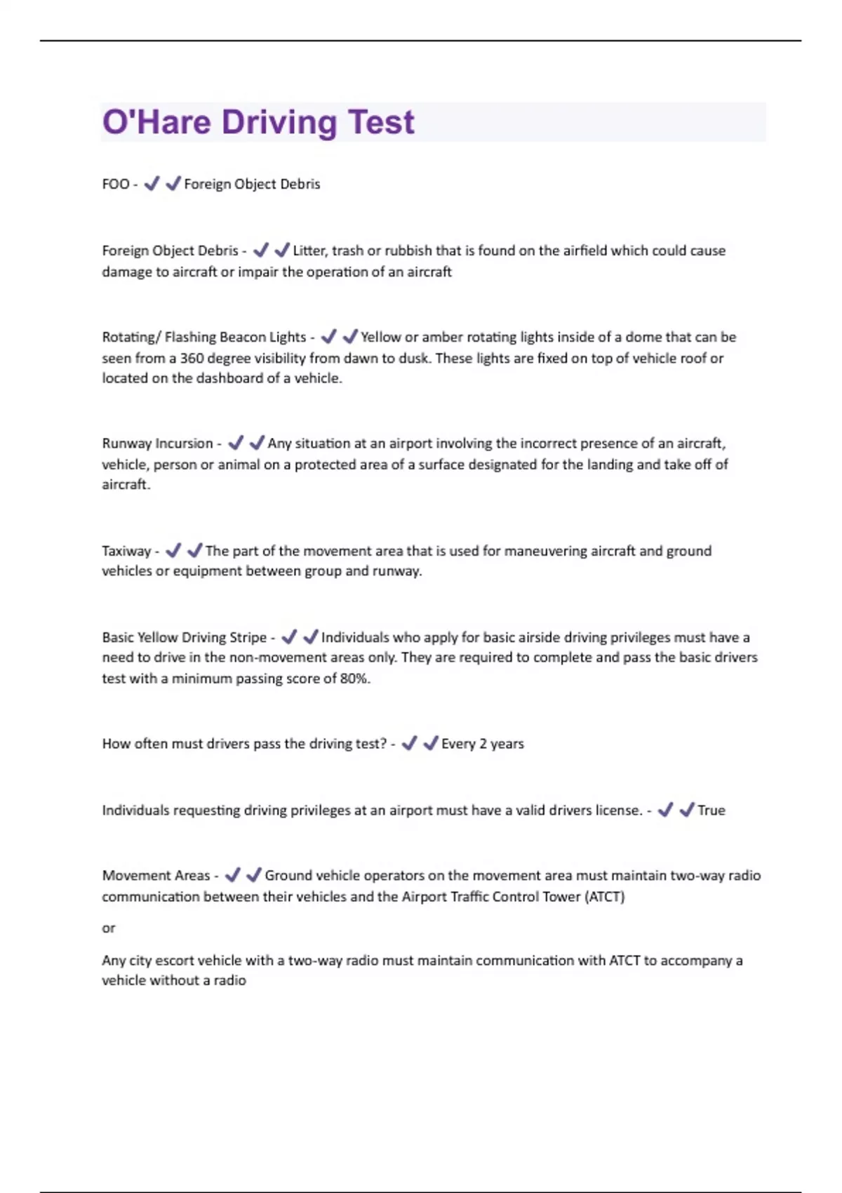 FOO - Foreign Object Debris Foreign Object Debris - Litter, trash or rubbish that is found on the airfield which could cause damage to aircraft or impair the operation of an aircraft Rotating/ Flashing Beacon Lights - Yellow or amber rotating lights inside of a dome that can be seen from a 360 degree visibility from dawn to dusk. These lights are fixed on top of vehicle roof or located on the dashboard of a vehicle. Runway Incursion - Any situation at an airport involving the incorrect presence of an aircraft, vehicle, person or animal on a protected area of a surface designated for the landing and take off of aircraft. Taxiway - The part of the movement area that is used for maneuvering aircraft and ground vehicles or equipment between group and runway. Basic Yellow Driving Stripe - Individuals who apply for basic airside driving privileges must have a need to drive in the non-movement areas only. They are required to complete and pass the basic drivers test with a minimum passing score of 80%. How often must drivers pass the driving test? - Every 2 years Individuals requesting driving privileges at an airport must have a valid drivers license. - True Movement Areas - Ground vehicle operators on the movement area must maintain two-way radio communication between their vehicles and the Airport Traffic Control Tower (ATCT) or Any city escort vehicle with a two-way radio must maintain communication with ATCT to accompany a vehicle without a radioRunway Incursion - Any occurrence at an aerodrome involving the incorrect presence of an aircraft vehicle or person on the protected area of a surface designated for the landing and take-off of aircraft. Who reviews all surface incidents and assigns severity? - FAA Category D Severity - Least serious- Little to no chance of collision but meets the definition of a runway incursion. Category C Severity - Separation decreases but there is ample time and distance to avoid a potential collision. Category B Severity - Separation decreases and there is a significant potential for collision. Category A Severity - Separation decreases and participants take extreme action to narrowly avoid a collision or the event results in a collision. Runway incursions area a _____ ________ and is the FAA priority for ____ ________ - National concern Aviation improvement No aircraft, ground motor vehicle or pedestrian may enter onto a runway without receiving a specific clearance to do so by the ___ ____ ___ ____ _____ - FAA Airport Traffic Control Tower Only ___ ____ ___ _____ _____ can give the authorization for entry onto a runway - FAA Air Traffic Control Personnel No person operating ground motor vehicle on a ramp, other than the operator of an aircraft- servicing vehicle will pass within _____ of a parked aircraft - 20 feetWhen an aircraft is being loaded/ unloaded at ground level, vehicles will not pass such an aircraft or terminal concourses while passengers are enplaning or deplaning. - True