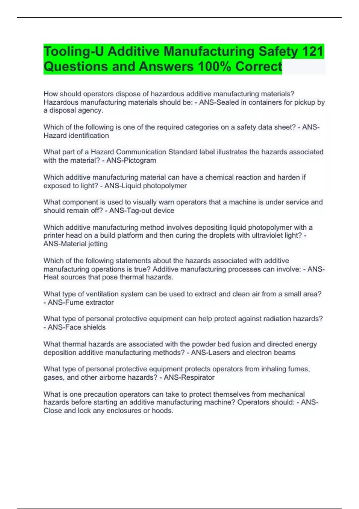 Tooling-U Additive Manufacturing Safety 121 Questions and Answers 100% Correct