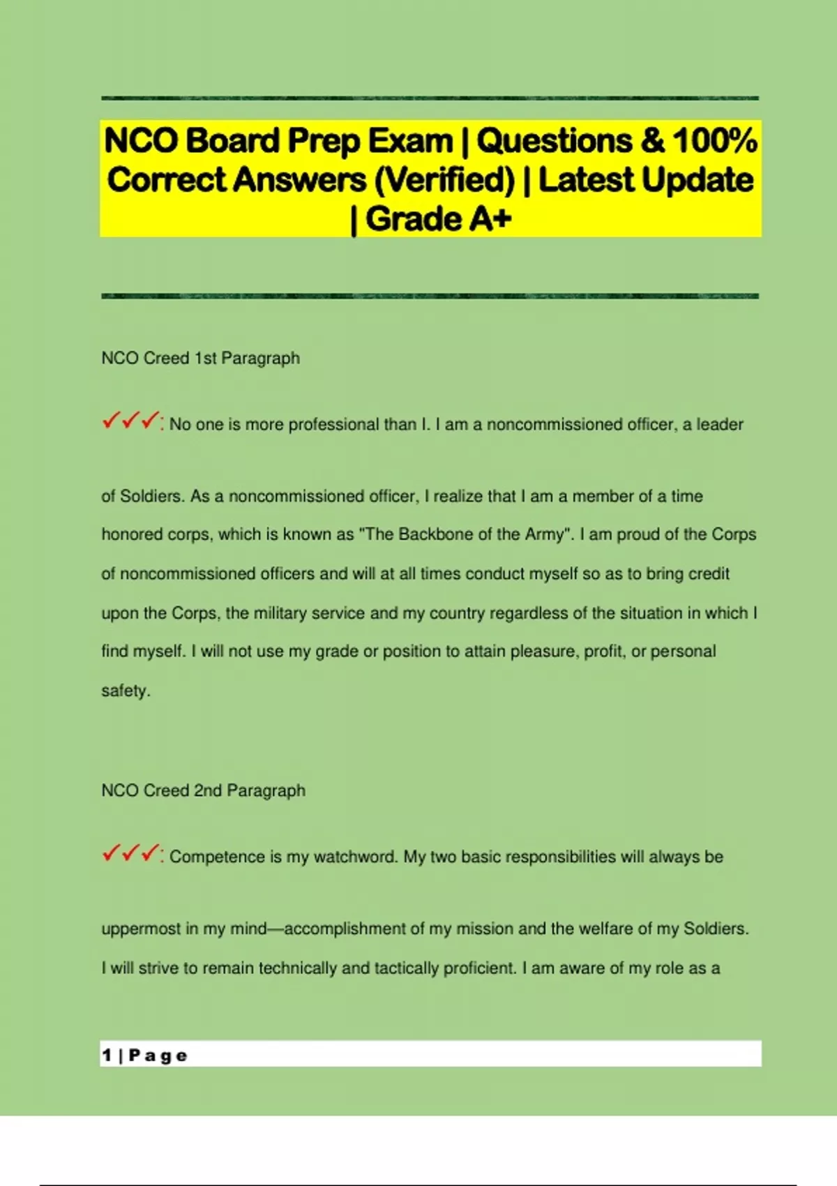 NCO Creed 1st Paragraph : No one is more professional than I. I am a noncommissioned officer, a leader of Soldiers. As a noncommissioned officer, I realize that I am a member of a time honored corps, which is known as "The Backbone of the Army". I am proud of the Corps of noncommissioned officers and will at all times conduct myself so as to bring credit upon the Corps, the military service and my country regardless of the situation in which I find myself. I will not use my grade or position to attain pleasure, profit, or personal safety. NCO Creed 2nd Paragraph : Competence is my watchword. My two basic responsibilities will always be uppermost in my mind—accomplishment of my mission and the welfare of my Soldiers. I will strive to remain technically and tactically proficient. I am aware of my role as a 2 | P a g e noncommissioned officer. I will fulfill my responsibilities inherent in that role. All Soldiers are entitled to outstanding leadership; I will provide that leadership. I know my Soldiers and I will always place their needs above my own. I will communicate consistently with my Soldiers and never leave them uninformed. I will be fair and impartial when recommending both rewards and punishment. NCO Creed 3rd Paragraph : Officers of my unit will have maximum time to accomplish their duties; they will not have to accomplish mine. I will earn their respect and confidence as well as that of my Soldiers. I will be loyal to those with whom I serve; seniors, peers, and subordinates alike. I will exercise initiative by taking appropriate action in the absence of orders. I will not compromise my integrity, nor my moral courage. I will not forget, nor will I allow my comrades to forget that we are p
