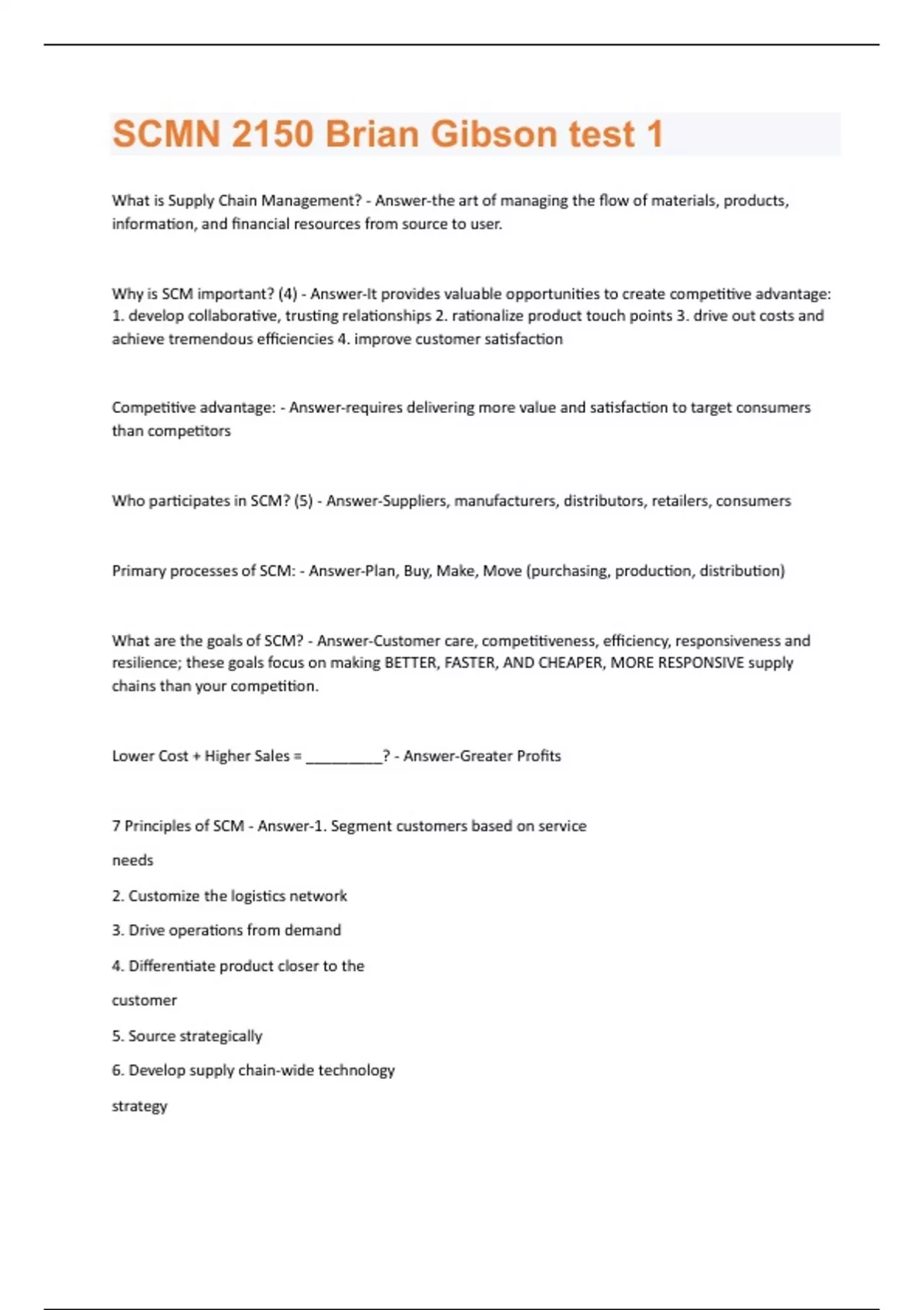What is Supply Chain Management? - Answer-the art of managing the flow of materials, products, information, and financial resources from source to user. Why is SCM important? (4) - Answer-It provides valuable opportunities to create competitive advantage: 1. develop collaborative, trusting relationships 2. rationalize product touch points 3. drive out costs and achieve tremendous efficiencies 4. improve customer satisfaction Competitive advantage: - Answer-requires delivering more value and satisfaction to target consumers than competitors Who participates in SCM? (5) - Answer-Suppliers, manufacturers, distributors, retailers, consumers Primary processes of SCM: - Answer-Plan, Buy, Make, Move (purchasing, production, distribution) What are the goals of SCM? - Answer-Customer care, competitiveness, efficiency, responsiveness and resilience; these goals focus on making BETTER, FASTER, AND CHEAPER, MORE RESPONSIVE supply chains than your competition. Lower Cost + Higher Sales = _________? - Answer-Greater Profits 7 Principles of SCM - Answer-1. Segment customers based on service needs 2. Customize the logistics network 3. Drive operations from demand 4. Differentiate product closer to the customer 5. Source strategically 6. Develop supply chain-wide technology strategy7. Use supply chain spanning performance measures How can an organization build competitive advantage via SCM? (6) - Answer-1. Cost (be low cost provider) 2. Quality (defect free products and services) 3. Speed (fast response time) 4. Reliability (consistent order cycle time) 5. Adaptability (deal with changing demand) 6. Flexibility (able to offer variety) Node - Answer-a fixed point in a supply chain where goods are processed, mixed, held, or sold. (plants, warehouses) Links - Answer-the transportation method used to connect the nodes in a supply chain. Centralized network - Answer-Management decision making authority is held by a core group of managers at a single node in the supply chain, as opposed to multiple nodes. The single node controls customer interaction, the flow of goods, and other key activities on a national basis. Centralized networks create (5): - Answer-lower safety stock, lower overhead cost (factories, supervisors, managers), longer lead times, higher delivery cost, inefficiencies. Decentralized network - Answer-Management decision making authority is given to the managers at (multiple) individual nodes in the supply chain. Each node controls customer interaction, the flow of goods, and other key activities within its region. Decentralized networks create (6): - Answer-more safety stock, high overhead cost, short lead times,customer service, low delivery costs, few economies of scale Centralized vs. Decentralized Characteristics - Answer-Centralized: Distribution- national Inventory investment- lower safety stock- lower inbound transportation costs- lower outbound transportation costs- higher service levels- effective Decentralized: Distribution: regional Inventory investment: greater Safety stock: higher Inbound transportation cost: higher outbound transportation cost: lower service levels: highly effective