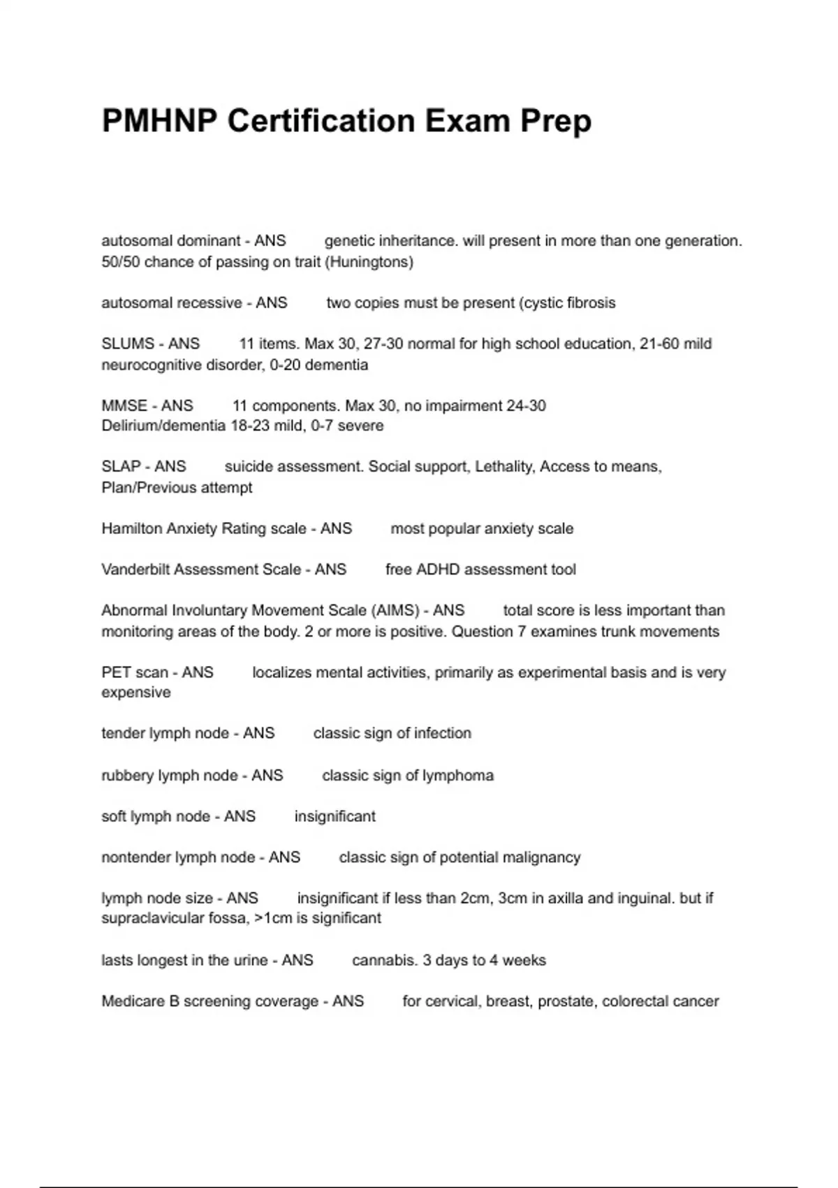 autosomal dominant - ANS genetic inheritance. will be present in more than one generation. 50/50 chance of passing on trait (Huningtons) autosomal recessive - ANS two copies must be present (cystic fibrosis SLUMS - ANS 11 items. Max 30, 27-30 normal for high school education, 21-60 mild neurocognitive disorder, 0-20 dementia MMSE - ANS 11 components. Max 30, no impairment 24-30 Delirium/dementia 18-23 mild, 0-7 severe SLAP - ANS suicide assessment. Social support, Lethality, Access to means, Plan/Previous attempt Hamilton Anxiety Rating scale - ANS most popular anxiety scale Vanderbilt Assessment Scale - ANS free ADHD assessment tool Abnormal Involuntary Movement Scale (AIMS) - ANS total score is less important than monitoring areas of the body. 2 or more is positive. Question 7 examines trunk movements PET scan - ANS localizes mental activities, primarily as experimental basis and is very expensive tender lymph node - ANS classic sign of infection rubbery lymph node - ANS classic sign of lymphoma soft lymph node - ANS insignificant nontender lymph node - ANS classic sign of potential malignancy lymph node size - ANS insignificant if less than 2cm, 3cm in axilla and inguinal. but if supraclavicular fossa, 1cm is significant lasts longest in the urine - ANS cannabis. 3 days to 4 weeks Medicare B screening coverage - ANS for cervical, breast, prostate, colorectal cancer top 4 killers of adults in US - ANS heart disease, cancer, lower resp disease, CVA lung cancer - ANS highest cancer mortality in women and men, primary prevention - ANS PROMOTES health PRIOR. healthy diet, exercise, avoiding things secondary prevention - ANS focuses on early identification and treatment of existing problems. includes REGULAR exams and screening like pap tertiary prevention - ANS rehab and restoration of health hepatitis A vaccine - ANS for military, travelers to endemic areas, men who have sex with men low T4 - ANS indicates disease state is due to thyroid gland hyperthyroid - ANS low TSH, high or normal T4 mimics mania