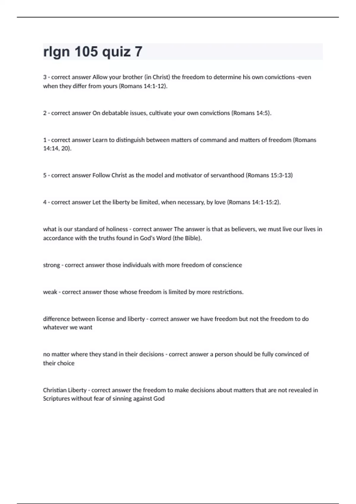 rlgn 105 quiz 7 Questions with complete solution 2024 rlgn 105 quiz 7 3 - correct answer Allow your brother (in Christ) the freedom to determine his own convictions -even when they differ from yours (Romans 14:1-12). 2 - correct answer On debatable issues, cultivate your own convictions (Romans 14:5). 1 - correct answer Learn to distinguish between matters of command and matters of freedom (Romans 14:14, 20). 5 - correct answer Follow Christ as the model and motivator of servanthood (Romans 15:3-13) 4 - correct answer Let the liberty be limited, when necessary, by love (Romans 14:1-15:2). what is our standard of holiness - correct answer The answer is that as believers, we must live our lives in accordance with the truths found in God's Word (the Bible). strong - correct answer those individuals with more freedom of conscience weak - correct answer those whose freedom is limited by more restrictions. difference between license and liberty - correct answer we have freedom but not the freedom to do whatever we want no matter where they stand in their decisions - correct answer a person should be fully convinced of their choice Christian Liberty - correct answer the freedom to make decisions about matters that are not revealed in Scriptures without fear
