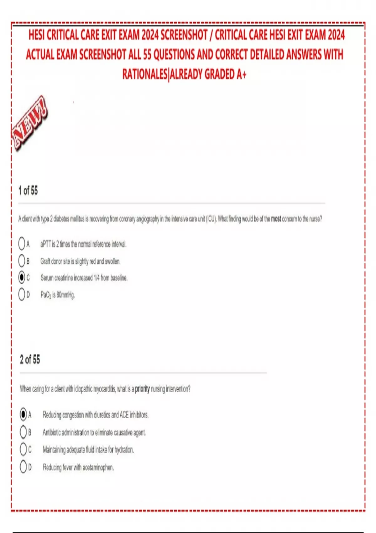 HESI CRITICAL CARE EXIT EXAM 2024 SCREENSHOT / CRITICAL CARE HESI EXIT EXAM 2024 ACTUAL EXAM SCREENSHOT ALL 55 QUESTIONS AND CORRECT DETAILED ANSWERS WITH RATIONALES|ALREADY GRADED A+