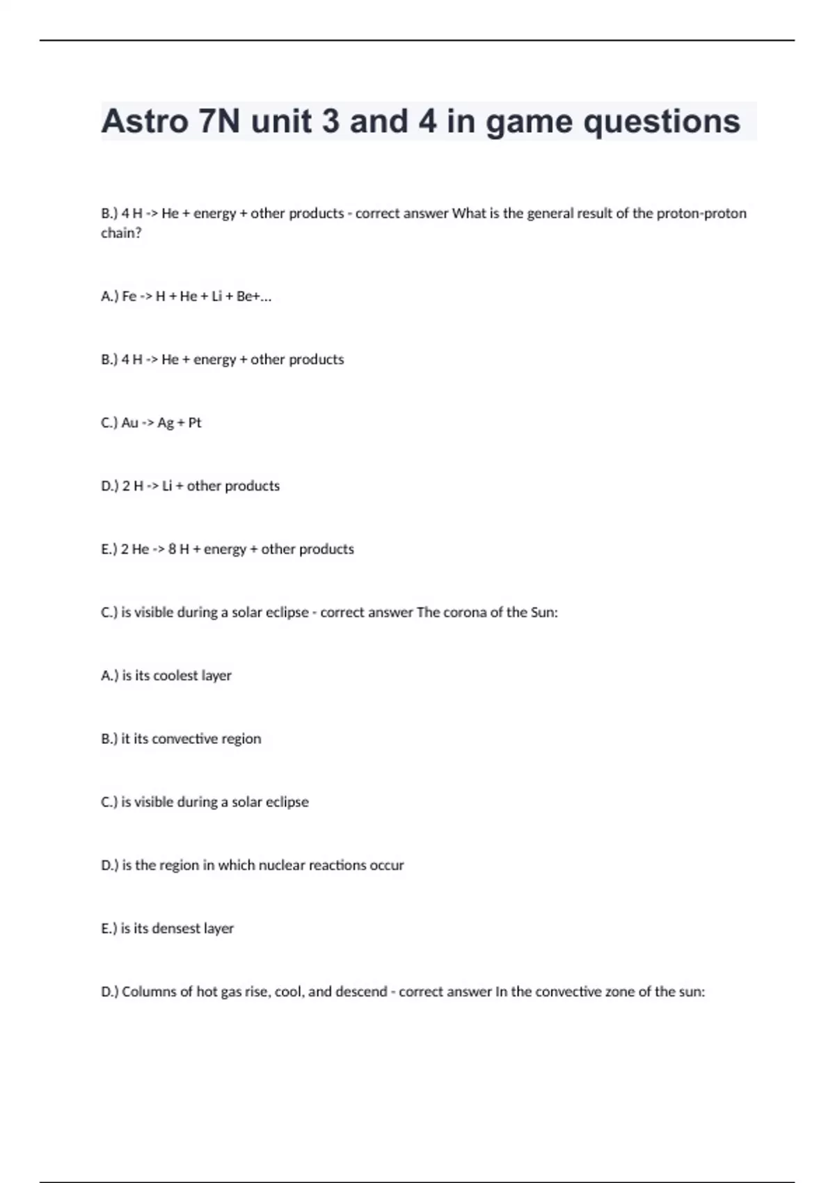 Astro 7N unit 3 and 4 in game questions and answers rated A+ 2024 Astro 7N unit 3 and 4 in game questions B.) 4 H -> He + energy + other products - correct answer What is the general result of the proton-proton chain? A.) Fe -> H + He + Li + Be+... B.) 4 H -> He + energy + other products C.) Au -> Ag + Pt D.) 2 H -> Li + other products E.) 2 He -> 8 H + energy + other products C.) is visible during a solar eclipse - correct answer The corona of the Sun: A.) is its coolest layer B.) it its convective region C.) is visible during a solar eclipse D.) is the region in which nuclear reactions occur E.) is its densest layer