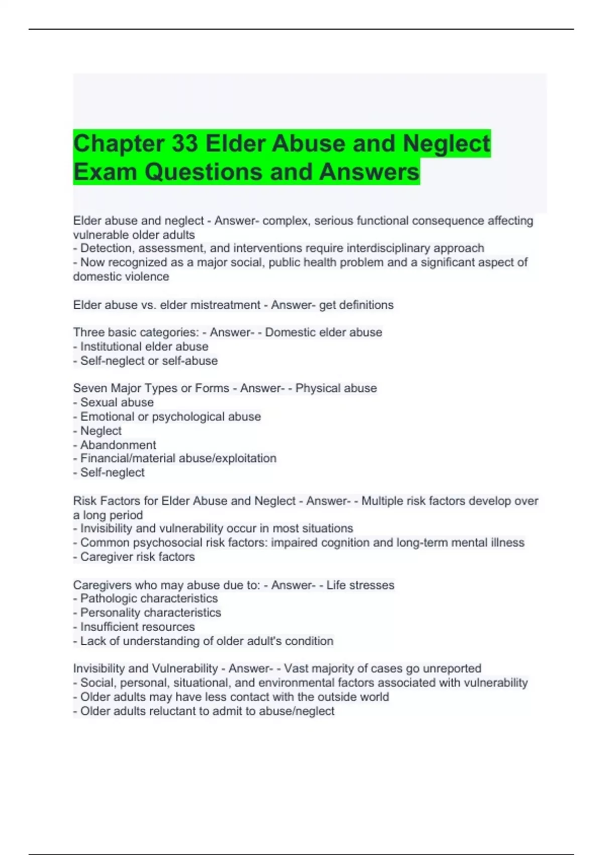 Chapter 33 Elder Abuse and Neglect Exam Questions and Answers