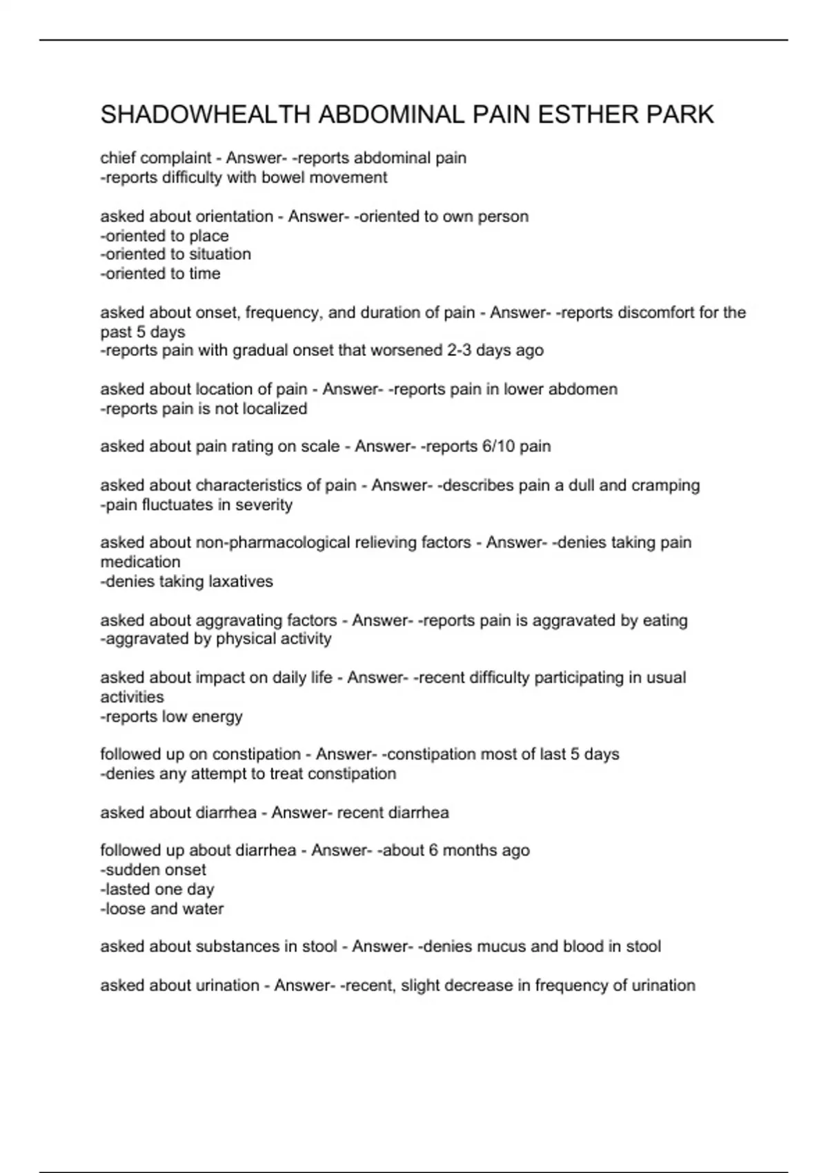 - SHADOWHEALTH ABDOMINAL PAIN ESTHER PARK