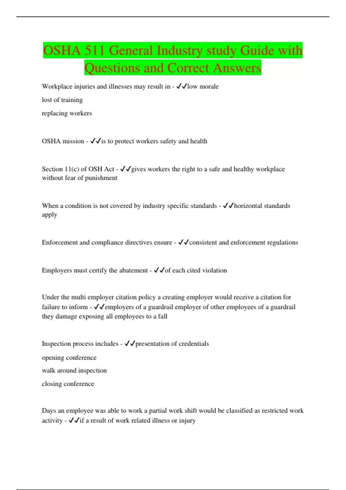 OSHA 511 General Industry study Guide with Questions and Correct Answers