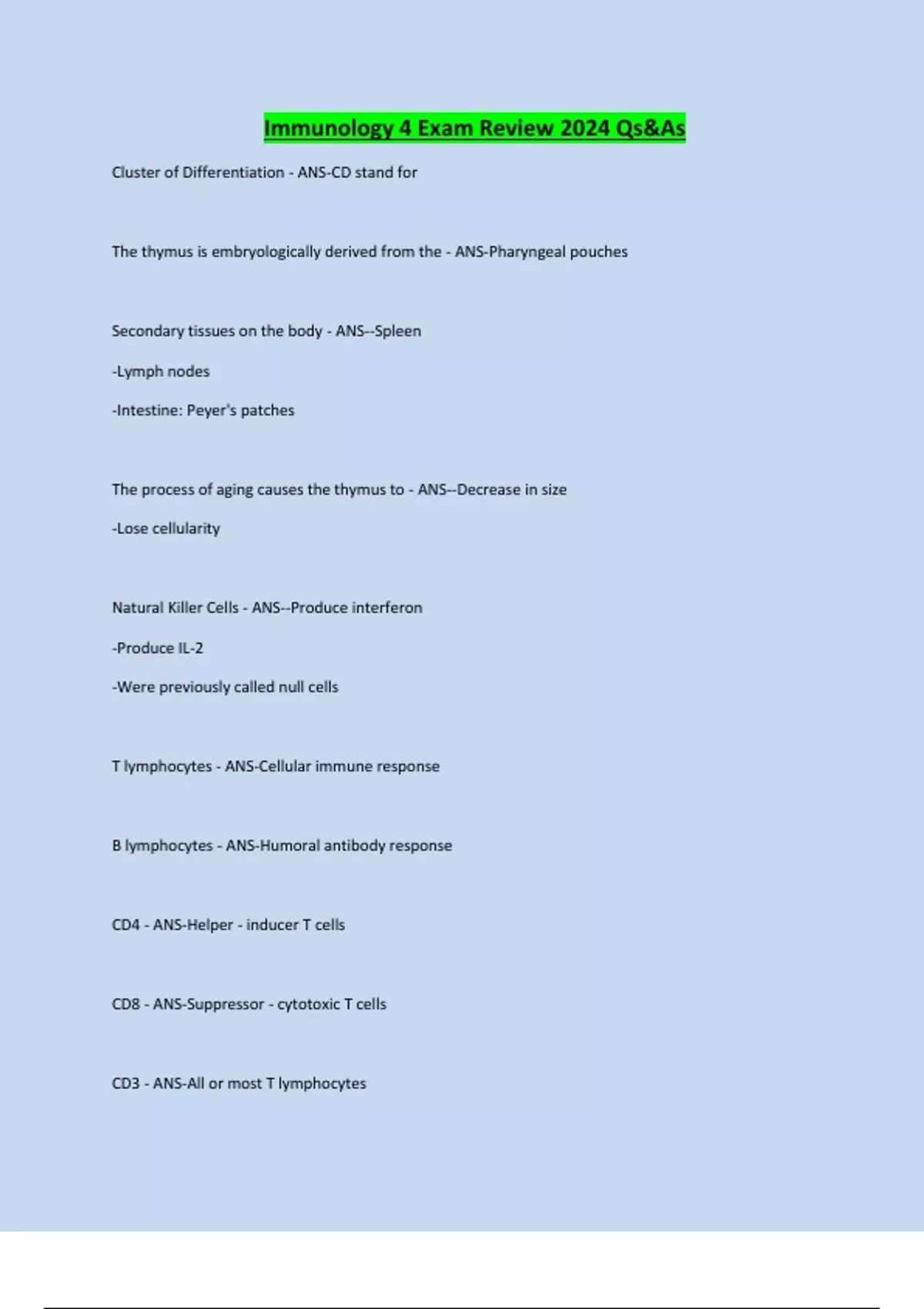 Immunology 4 Exam Review 2024 Qs&As Cluster of Differentiation - ANS-CD stand for The thymus is embryologically derived from the - ANS-Pharyngeal pouches Secondary tissues on the body - ANS--Spleen -Lymph nodes -Intestine: Peyer's patches The process of aging causes the thymus to - ANS--Decrease in size -Lose cellularity Natural Killer Cells - ANS--Produce interferon -Produce IL-2 -Were previously called null cells T lymphocytes - ANS-Cellular immune response B lymphocytes - ANS-Humoral antibody response CD4 - ANS-Helper - inducer T cells CD8 - ANS-Suppressor - cytotoxic T cells CD3 - ANS-All or most T lymphocytes Continues...