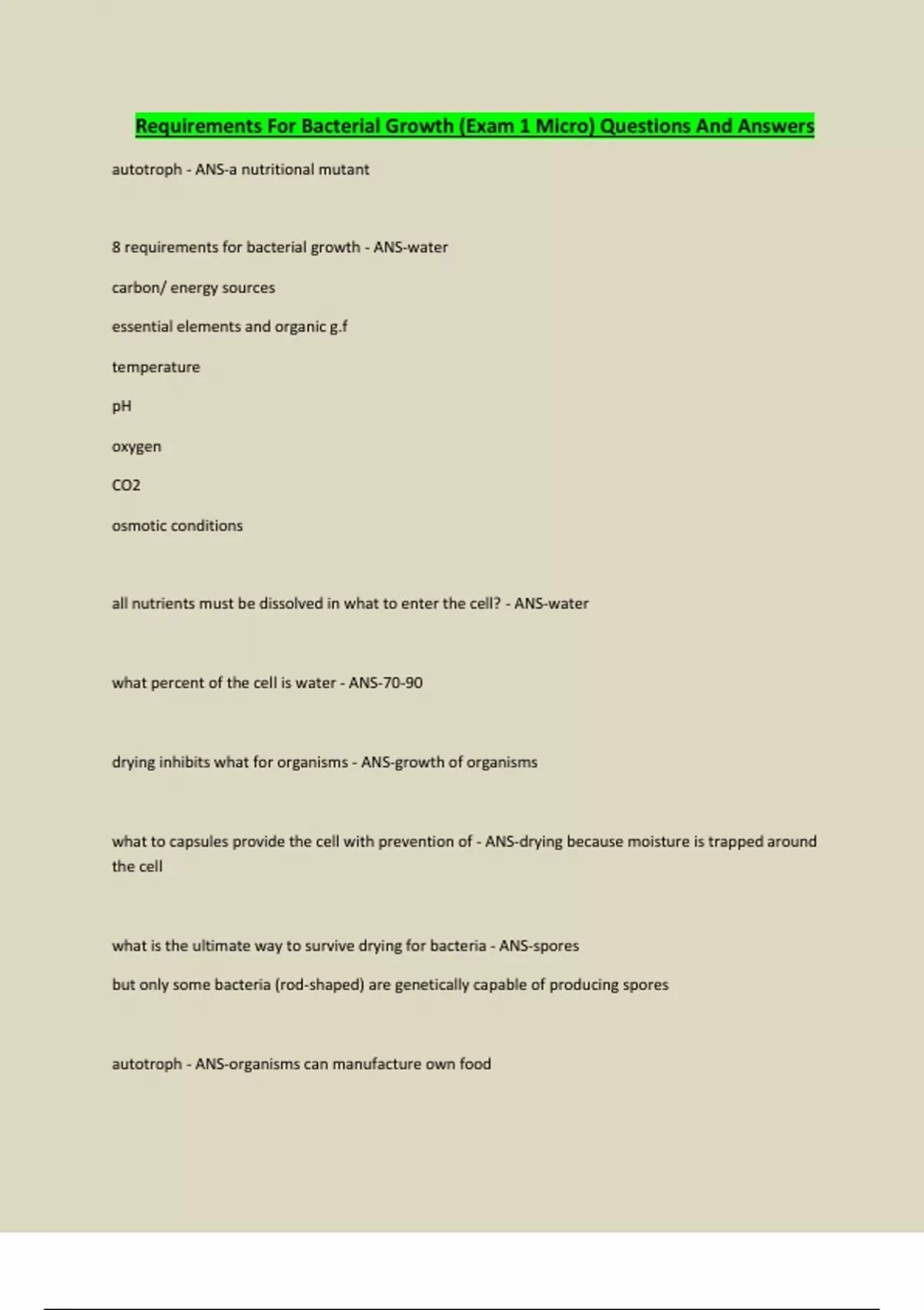 Requirements For Bacterial Growth (Exam 1 Micro) Questions And Answers autotroph - ANS-a nutritional mutant 8 requirements for bacterial growth - ANS-water carbon/ energy sources essential elements and organic g.f temperature pH oxygen CO2 osmotic conditions all nutrients must be dissolved in what to enter the cell? - ANS-water what percent of the cell is water - ANS-70-90 drying inhibits what for organisms - ANS-growth of organisms what to capsules provide the cell with prevention of - ANS-drying because moisture is trapped around the cell what is the ultimate way to survive drying for bacteria - ANS-spores but only some bacteria (rod-shaped) are genetically capable of producing spores autotroph - ANS-organisms can manufacture own food heterotrophs - ANS-consume food produced by others photoautotroph - ANS-produce food from sunlight (green plants) chemotrophs - ANS...