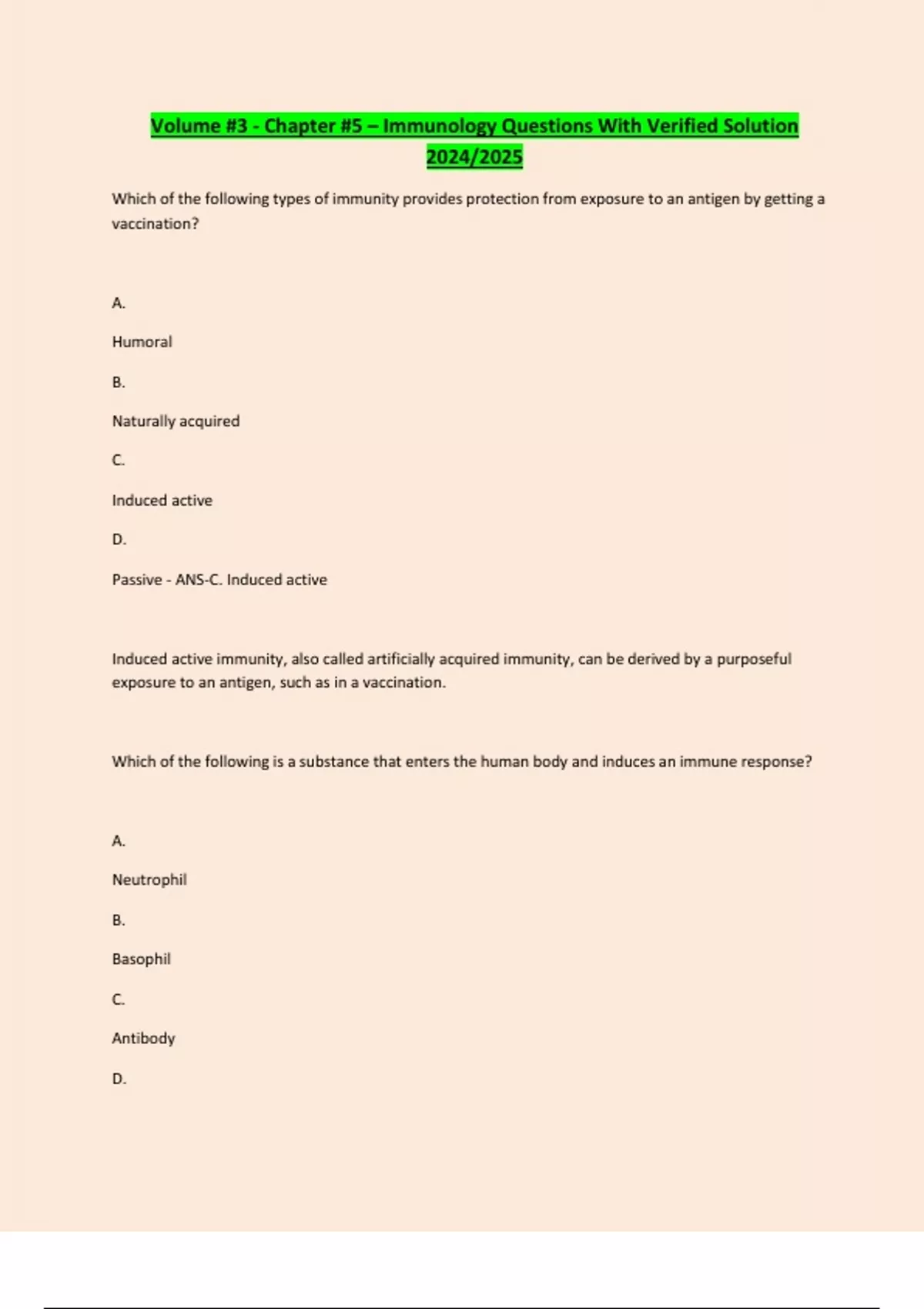 Volume #3 - Chapter #5 – Immunology Questions With Verified Solution 2024/2025 Which of the following types of immunity provides protection from exposure to an antigen by getting a vaccination? A. Humoral B. Naturally acquired C. Induced active D. Passive - ANS-C. Induced active Induced active immunity, also called artificially acquired immunity, can be derived by a purposeful exposure to an antigen, such as in a vaccination. Which of the following is a substance that enters the human body and induces an immune response? A. Neutrophil B. Basophil C. Antibody D. Antigen - ANS-D. Antigen An antigen is any substance capable of inducing an immune response. Most antigens are proteins. What is the term for an unexpected and exaggerated reaction to a particular antigen?...