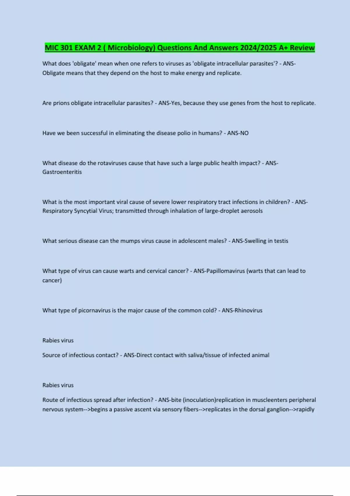 MIC 301 EXAM 2 ( Microbiology) Questions And Answers 2024/2025 A+ Review What does 'obligate' mean when one refers to viruses as 'obligate intracellular parasites'? - ANSObligate means that they depend on the host to make energy and replicate. Are prions obligate intracellular parasites? - ANS-Yes, because they use genes from the host to replicate. Have we been successful in eliminating the disease polio in humans? - ANS-NO What disease do the rotaviruses cause that have such a large public health impact? - ANSGastroenteritis What is the most important viral cause of severe lower respiratory tract infections in children? - ANSRespiratory Syncytial Virus; transmitted through inhalation of large-droplet aerosols What serious disease can the mumps virus cause in adolescent males? - ANS-Swelling in testis What type of virus can cause warts and cervical cancer? - ANS-Papillomavirus (warts that can lead to cancer) What type of picornavirus is the major cause of the common cold? - ANS-Rhinovirus Rabies virus Source of infectious contact? - ANS Continues...