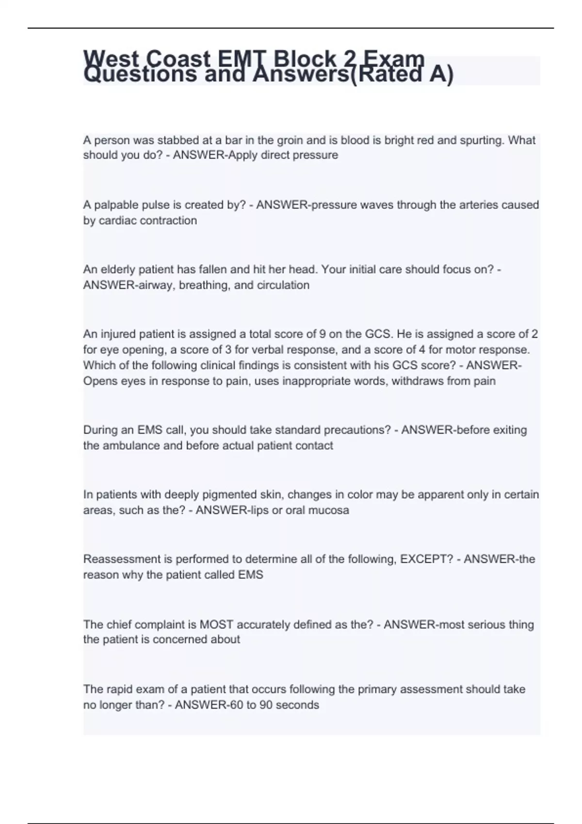 west coast emt block 2 exam questions stuvia