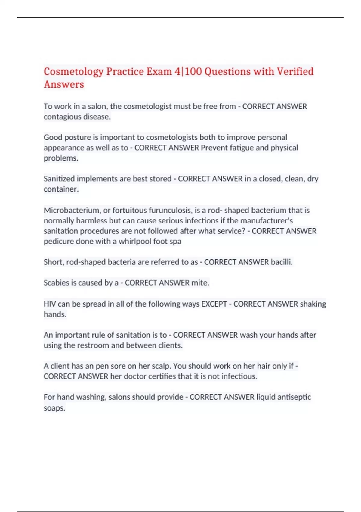 Cosmetology Practice Exam 4|100 Questions with Verified Answers To work in a salon, the cosmetologist must be free from - CORRECT ANSWER contagious disease. Good posture is important to cosmetologists both to improve personal appearance as well as to - CORRECT ANSWER Prevent fatigue and physical problems. Sanitized implements are best stored - CORRECT ANSWER in a closed, clean, dry container. Microbacterium, or fortuitous furunculosis, is a rod- shaped bacterium that is normally harmless but can cause serious infections if the manufacturer's sanitation procedures are not followed after what service? - CORRECT ANSWER pedicure done with a whirlpool foot spa Short, rod-shaped bacteria are referred to as - CORRECT ANSWER bacilli. Scabies is caused by a - CORRECT ANSWER mite. HIV can be spread in all of the following ways EXCEPT - CORRECT ANSWER shaking hands. An important rule of sanitation is to - CORRECT ANSWER wash your hands after using the restroom and between clients. A client has an pen sore on her scalp. You should work on her hair only if - CORRECT ANSWER her doctor certifies that it is not infectious. For hand washing, salons should provide - CORRECT ANSWER liquid antiseptic soaps. Hepatitis is a virus transmitted through body fluids and the blood or by a cut or sore on the skin. What other virus is this similar to? - CORRECT ANSWER HIV Sebaceous glands in the scalp and skin produce - CORRECT ANSWER oil What should the label of a disinfectant say to ensure that it will be effective against virus-causing organisms in your salon? - CORRECT ANSWER hospital-grade disinfectant with virucide and tuberculocide, EPA registered The hair's pigment, or color, is found in its - CORRECT ANSWER cortex. The art of shaping and molding the hair into as S pattern using fingers, comb, and waving lotion is - CORRECT ANSWER finger wave. Hair is made of the same protein as the - CORRECT ANSWER nails. The average nail grows approximately how fast? - CORRECT ANSWER 1/8 inch per month A patch terse is NOT necessary for a - CORRECT ANSWER temporary color. What advice would you give to a client with badly bitten nails who asks for advice on how to stop this habit? - CORRECT ANSWER Frequent manicures may motivate him or her to stop. The main effect of aging on the skin is - CORRECT ANSWER loss of elasticity. Which of the following is an example of a seasonal condition? - CORRECT ANSWER prickly heat A callus that grows inward is referred to as a - CORRECT ANSWER corn. The integumentary system includes the - CORRECT ANSWER skin and its accessory organs. As a cosmetologist, you need to understand the muscle structure of the face and neck in order to - CORRECT ANSWER give an effective and relaxing massage. Which branch of the seventh cranial nerve affects the muscles at the base of the skull behind the ear? - CORRECT ANSWER posterior auricular The sweat and oil glands found in the skin are examples of - CORRECT ANSWER exocrine glands. A coloring technique that involves painting lightener on the hair with a tint brush or rat tail comb is called - CORRECT ANSWER balayage. In hair coloring, when should you recommend a color filler? - CORRECT ANSWER before performing a tint back on lightened hair Which of the following hair-care substances has an acidic pH? - CORRECT ANSWER conditioner Permanent waving works by - CORRECT ANSWER breaking and rearranging the hair's disulfide bonds. Which substance is capable of dissolving the greatest number of other substances? - CORRECT ANSWER water What should be used to presoften resistant hair to make it more receptive to hair color? - CORRECT ANSWER 20 volume peroxide A complete business plan would include all of the following EXCEPT - CORRECT ANSWER the names and addresses of employees. The largest expense involved in running a salon is for - CORRECT ANSWER salaries. The outer layer of the skin is called the - CORRECT ANSWER epidermis. When you are using a hot wax for temporary hair removal on the eyebrows, the wax is applied and then removed with a fabric strip. In which direction is the fabric strip removed? - CORRECT ANSWER in the opposite direction of the growth To prepare a client for a haircut, what additional step is necessary after shampooing? - CORRECT ANSWER Remove the outer towel and replace it with a neck strip. Trichology deals with the scientific study of the - CORRECT ANSWER hair. The technical term for bitten nails is - CORRECT ANSWER onychophagy. How should a stylist approach selling additional products and services to clients? - CORRECT ANSWER with sincere concern for the client's needs Start at the ________ when manipulating the scalp during a shampoo. - CORRECT ANSWER front hairline A shampoo with a pH higher than 7 is said to be - CORRECT ANSWER alkaline. A cream rinse is occasionally used to - CORRECT ANSWER make the hair softer and easier to comb. All disposable materials used during a manicure should be placed in - CORRECT ANSWER a plastic bag attached to the manicure table. It is important to use light pressure when working with a cuticle pusher or orange wood stick so that the - CORRECT ANSWER nail bed will not be injured. The purpose of nail wrapping is to - CORRECT ANSWER protect the nail or mend a broken nail. When applying press-on artificial nails, you should put the adhesive on the - CORRECT ANSWER edges of the client's nails and inside of the artificial nails. When giving a pedicure, you should loosen and push back the cuticles with - CORRECT ANSWER an orangewood stick. Which massage movement is described as a deep, rubbing movement? - CORRECT ANSWER friction Normal skin and a healthy scalp can obtain the greatest benefit from a massage once each - CORRECT ANSWER week. You should help your client to relax before a facial by - CORRECT ANSWER providing a pleasant, quiet atmosphere and speaking professionally. Which of the following is the correct procedure for a facial? - CORRECT ANSWER cleansing, steaming, massage, mask Your client has acne, and s