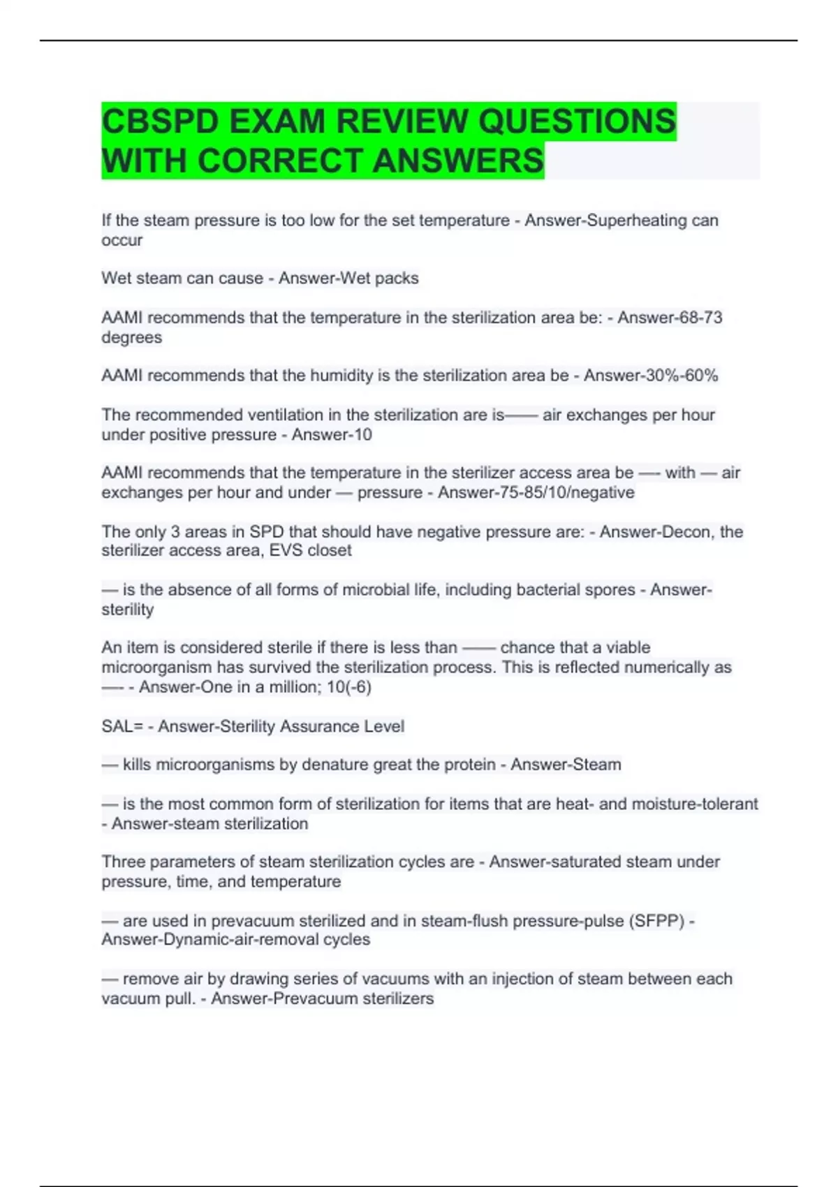 CBSPD EXAM REVIEW QUESTIONS WITH CORRECT ANSWERS Air and steam exit through the - Answer-Chamber drain A package that has visible moisture, such as droplets, on the outside or inside - Answer-Wet pack When multiple wet packs are found in the same load, the load is referred to as a: - Answer-Wet load Instrument sets in mesh-bottom trays or rigid sterilization containers should be placed: - Answer-Flat on the sterilizer rack Heavier sets should be placed on the bottom racks because they tend to produce more: - Answer-Condensation — should never be stacked - Answer-Wrapped