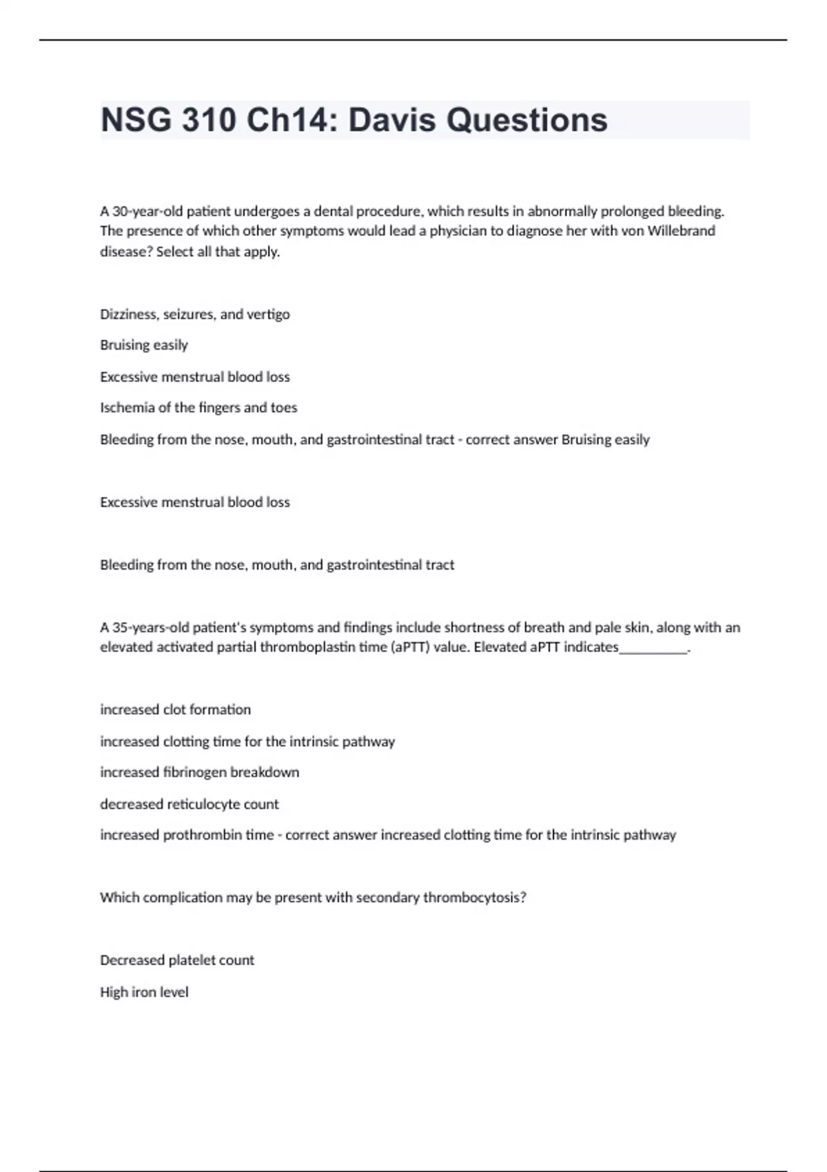 NSG 310 Ch14: Davis Questions A 30-year-old patient undergoes a dental procedure, which results in abnormally prolonged bleeding. The presence of which other symptoms would lead a physician to diagnose her with von Willebrand disease? Select all that apply. Dizziness, seizures, and vertigo Bruising easily Excessive menstrual blood loss Ischemia of the fingers and toes Bleeding from the nose, mouth, and gastrointestinal tract - correct answer Bruising easily Excessive menstrual blood loss Bleeding from the nose, mouth, and gastrointestinal tract A 35-years-old patient's symptoms and findings include shortness of breath and pale skin, along with an elevated activated partial thromboplastin time (aPTT) value. Elevated aPTT indicates_________. increased clot formation increased clotting time for the intrinsic pathway increased fibrinogen breakdown decreased reticulocyte count increased prothrombin time - correct answer increased clotting time for the intrinsic pathway Which complication may be present with secondary thrombocytosis? Decreased platelet count High iron level High serum ferritin
