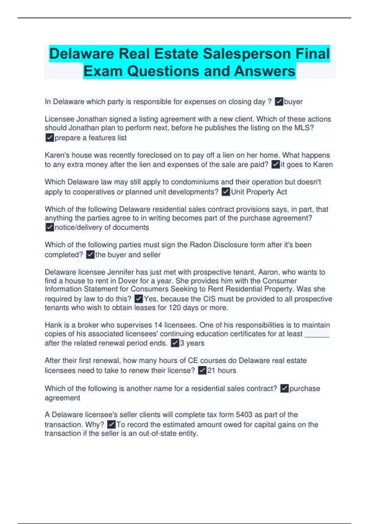 Delaware Real Estate Salesperson Final Exam Questions and Answers