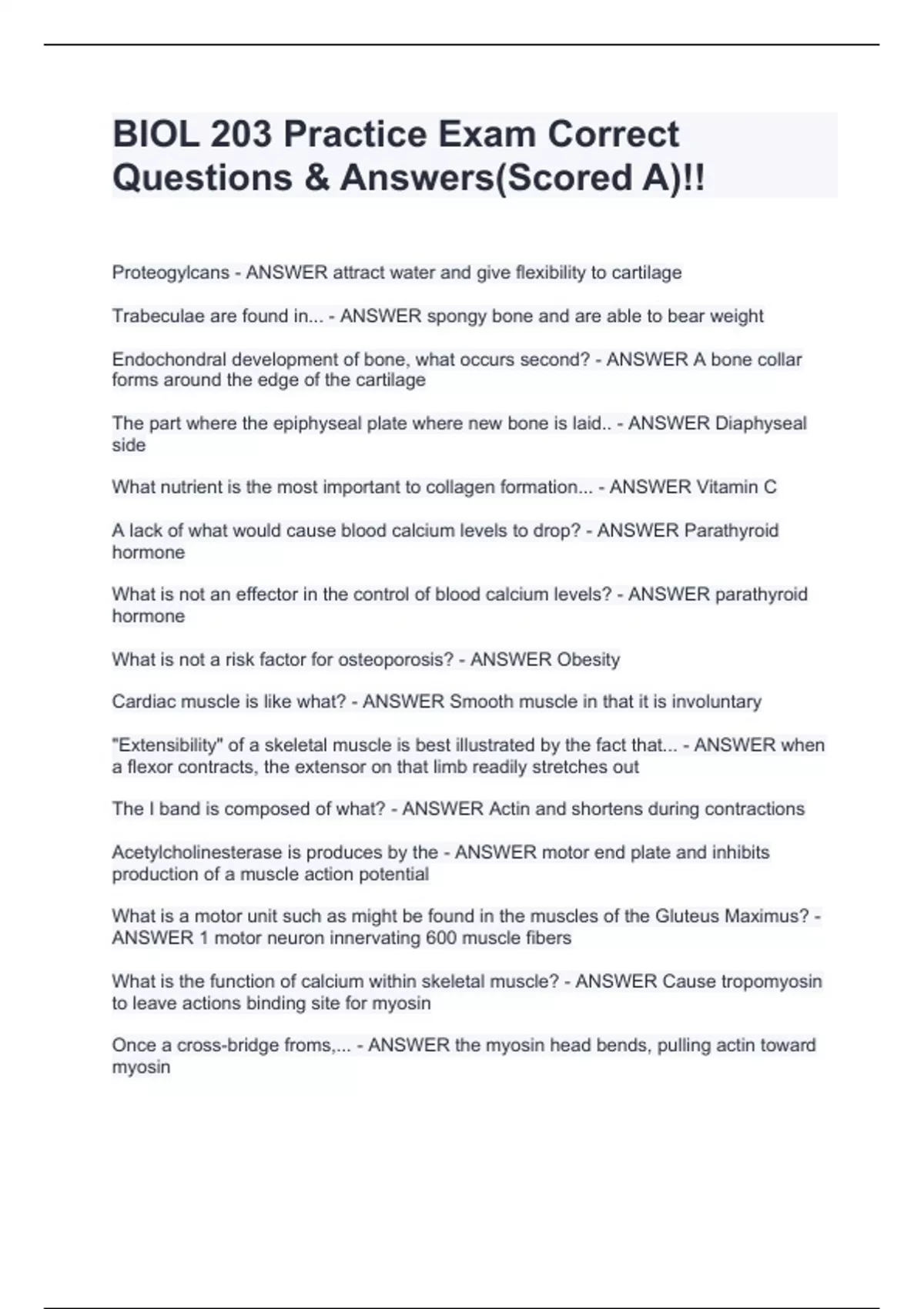 BIOL 203 Practice Exam Correct Questions & Answers(Scored A)!! Proteogylcans - ANSWER attract water and give flexibility to cartilage Trabeculae are found in... - ANSWER spongy bone and are able to bear weight Endochondral development of bone, what occurs second? - ANSWER A bone collar forms around the edge of the cartilage The part where the epiphyseal plate where new bone is laid.. - ANSWER Diaphyseal side What nutrient is the most important to collagen formation... - ANSWER Vitamin C A lack of what would cause blood calcium levels to drop? - ANSWER Parathyroid hormone What is not an effector in the control of blood calcium levels? - ANSWER parathyroid hormone What is not a risk factor for osteoporosis? - ANSWER Obesity Cardiac muscle is like what? - ANSWER Smooth muscle in that it is involuntary "Extensibility" of a skeletal muscle is best illustrated by the fact that... - ANSWER when a flexor contracts, the extensor on that limb readily stretches out The I band is composed of what? - ANSWER Actin and shortens during contractions Acetylcholinesterase is produces by the - ANSWER motor end plate and inhibits production of a muscle action potential