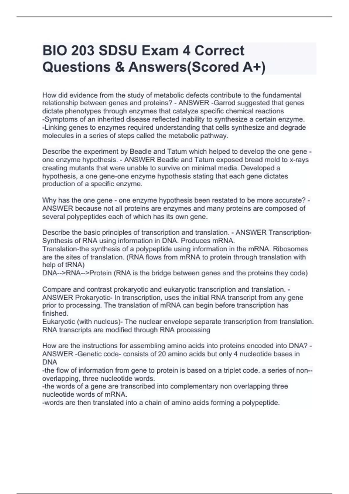 BIO 203 SDSU Exam 4 Correct Questions & AnsweHow did evidence from the study of metabolic defects contribute to the fundamental relationship between genes and proteins? - ANSWER -Garrod suggested that genes dictate phenotypes through enzymes that catalyze specific chemical reactions -Symptoms of an inherited disease reflected inability to synthesize a certain enzyme. -Linking genes to enzymes required understanding that cells synthesize and degrade molecules in a series of steps called the metabolic pathway. Describe the experiment by Beadle and Tatum which helped to develop the one gene - one enzyme hypothesis. - ANSWER Beadle and Tatum exposed bread mold to x-rays creating mutants that were unable to survive on minimal media. Developed a hypothesis, a one gene-one enzyme hypothesis stating that each gene dictates production of a specific enzyme. Why has the one gene - one enzyme hypothesis been restated to be more accurate? - ANSWER because not all proteins are enzymes and many proteins are composed of several polypeptides each of which has its own gene. Describe the basic principles of transcription and translation. - ANSWER Transcription- Synthesis of RNA using information in DNA. Produces mRNA. Translation-the synthesis of a polypeptide using information in the mRNA. Ribosomes are the sites of translation. (RNA flows from mRNA to protein through translation with help of tRNA) DNA-->RNA-->Protein (RNA is the bridge between genes and the proteins they code) Compare and contrast prokaryotic and eukaryotic transcription and translation. - ANSWER Prokaryotic- In transcription, uses the initial RNA transcript from any gene prirs(Scored A+)