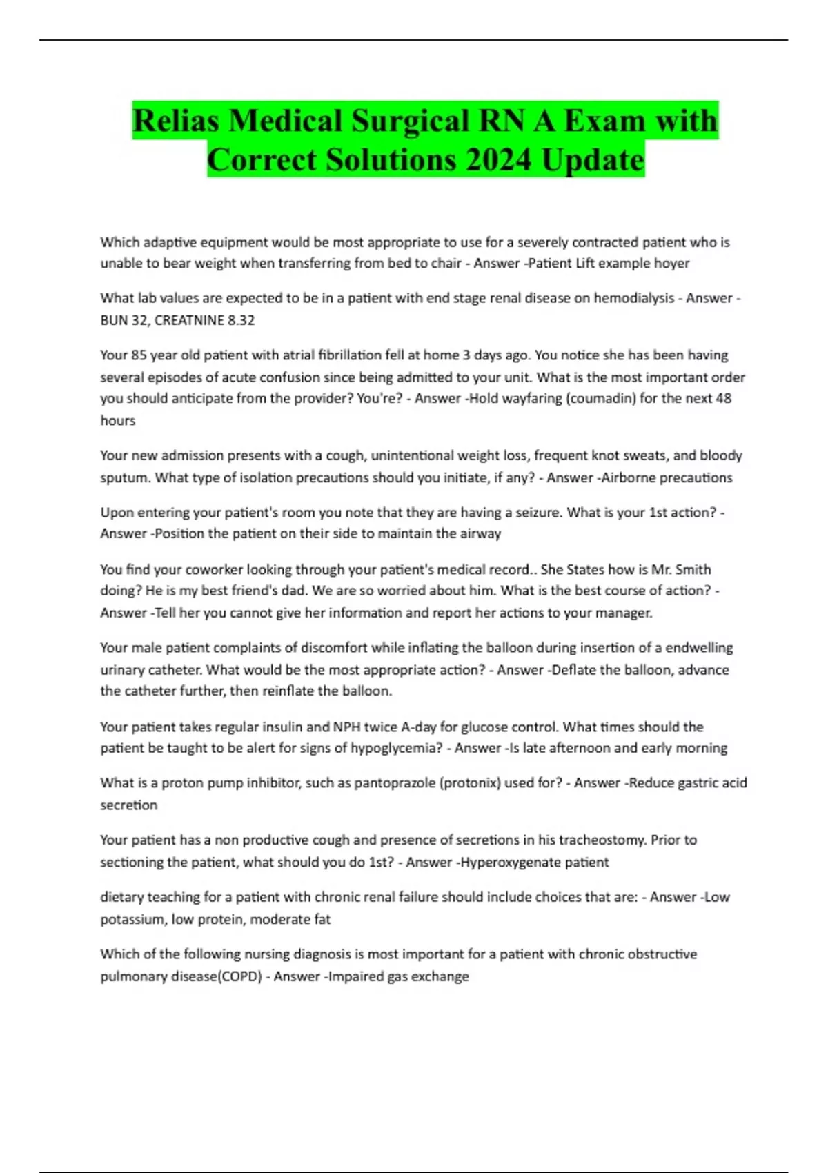 Relias Medical Surgical RN A Exam with Correct Solutions 2024 Update Which adaptive equipment would be most appropriate to use for a severely contracted patient who is unable to bear weight when transferring from bed to chair - Answer -Patient Lift example hoyer What lab values are expected to be in a patient with end stage renal disease on hemodialysis - Answer - BUN 32, CREATNINE 8.32 Your 85 year old patient with atrial fibrillation fell at home 3 days ago. You notice she has been having several episodes of acute confusion since being admitted to your unit. What is the most important order you should anticipate from the provider? You're? - Answer -Hold wayfaring (coumadin) for the next 48 hours Your new admission presents with a cough, unintentional weight loss, frequent knot sweats, and bloody sputum. What type of isolation precautions should you initiate, if any? - Answer -Airborne precautions Upon entering your patient's room you note that they are having a seizure. What is your 1st action? - Answer -Position the patient on their side to maintain the airway You find your coworker looking through your patient's medical record.. She States how is Mr. Smith doing? He is my best friend's dad. We are so worried about him. What is the best course of action? - Answer -Tell her you cannot give her information and report her actions to your manager. Your male patient complaints of discomfort while inflating the balloon during insertion of a endwelling urinary catheter. What would be the most appropriate action? - Answer -Deflate the balloon, advance the catheter further, then reinflate the balloon. Your patient takes regular insulin and NPH twice A-day for glucose control. What times should the patient be taught to be alert for signs of hypoglycemia? - Answer -Is late afternoon and early morning What is a proton pump inhibitor, such as pantoprazole (protonix) used for? - Answer -Reduce gastric acid secretion Your patient has a non productive cough and presence of secretions in his tracheostomy. Prior to sectioning the patient, what should you do 1st? - Answer -Hyperoxygenate patient dietary teaching for a patient with chronic renal failure should include choices that are: - Answer -Low potassium, low protein, moderate fat