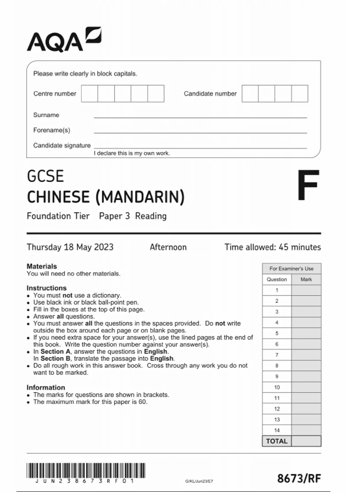 AQA GCSE CHINESE MANDARIN QUESTION PAPER 3 2023 [8673/RF: Foundation Tier Reading]