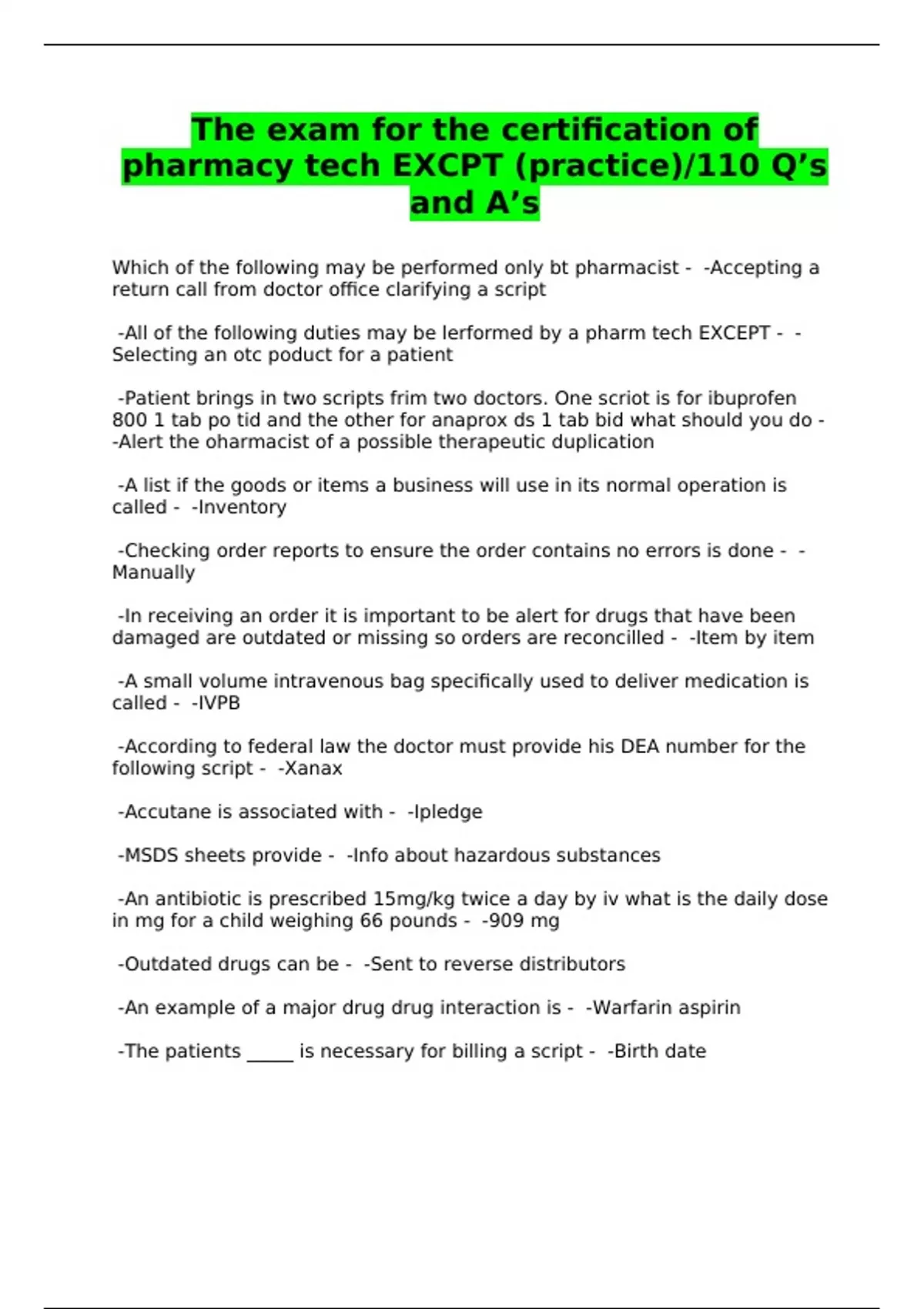 The exam for the certification of pharmacy tech EXCPT (practice)/110 Q’s and A’s