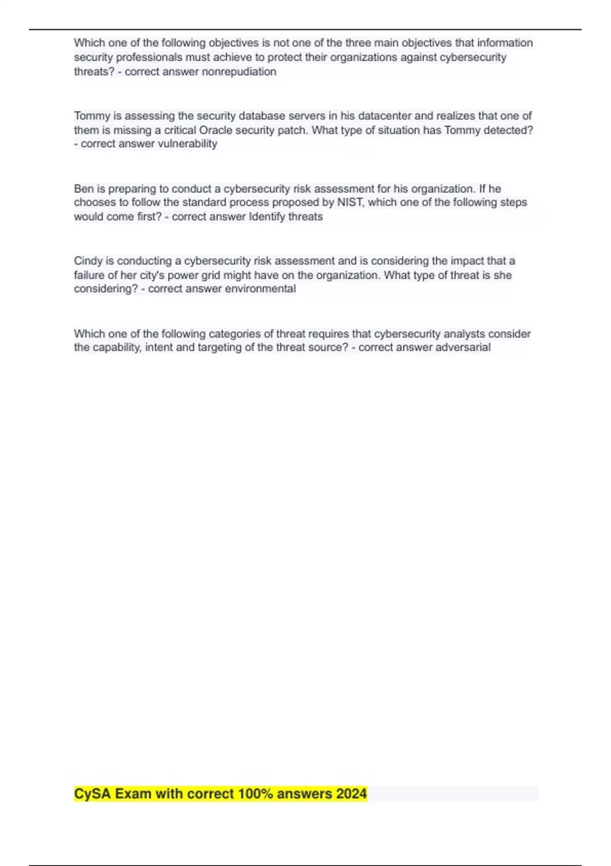 CySA Exam with correct 100% answers 2024