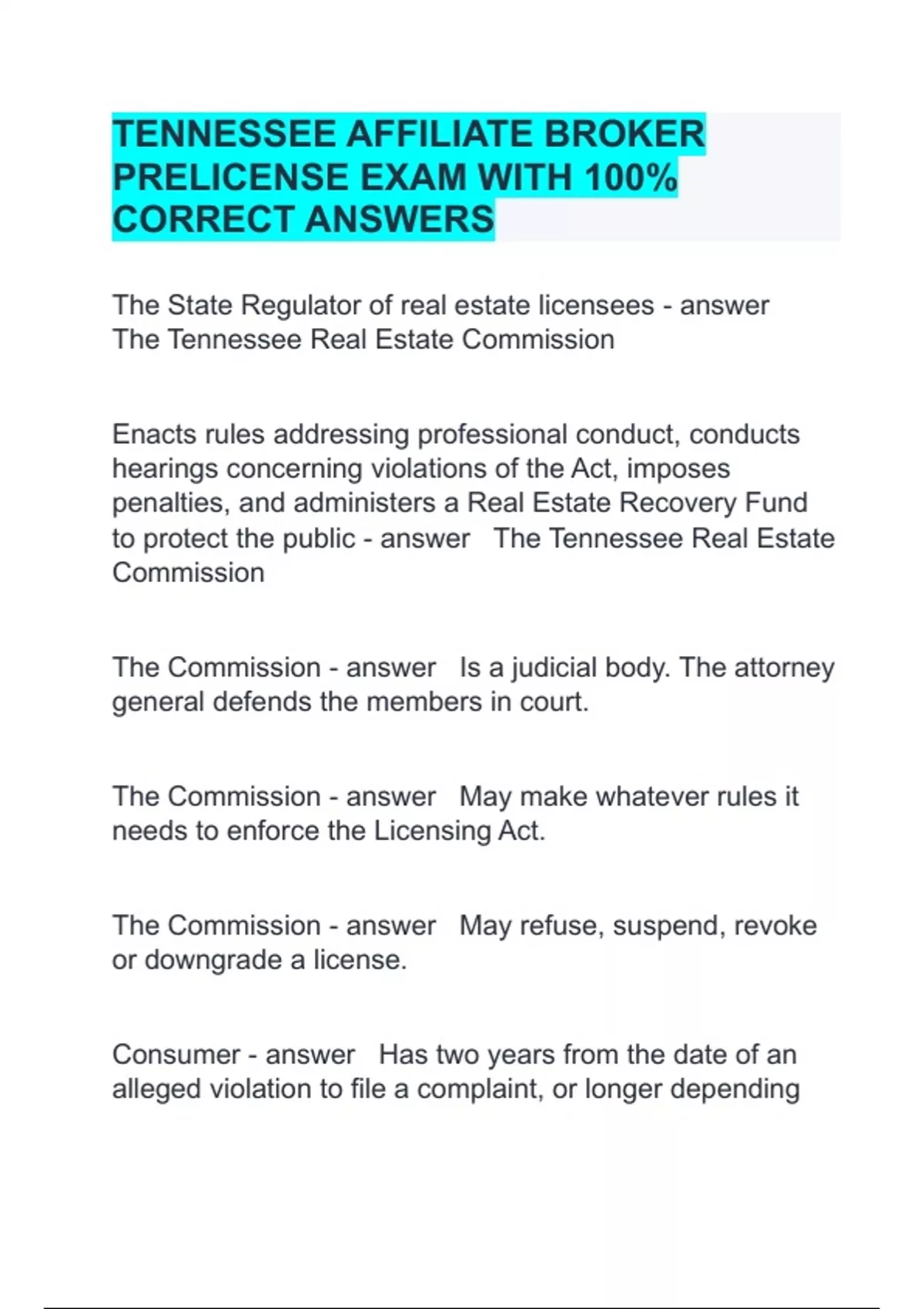 TENNESSEE AFFILIATE BROKER PRELICENSE EXAM WITH 100% CORRECT ANSWERS